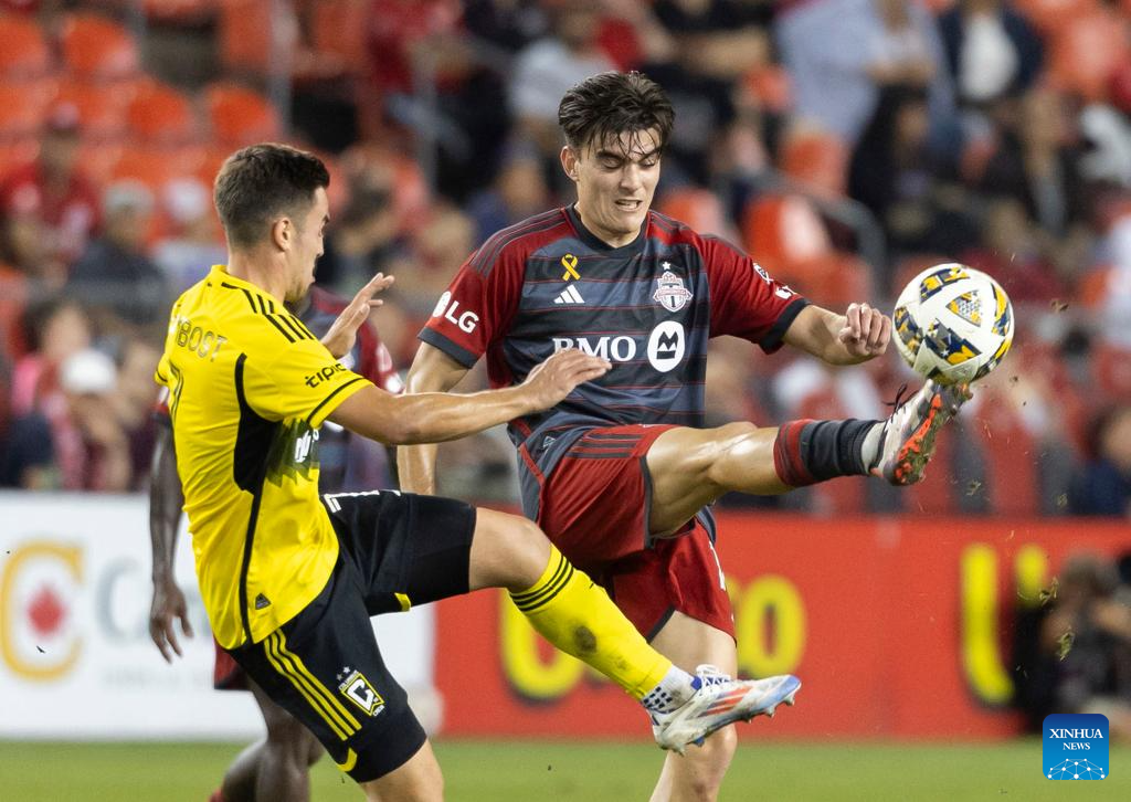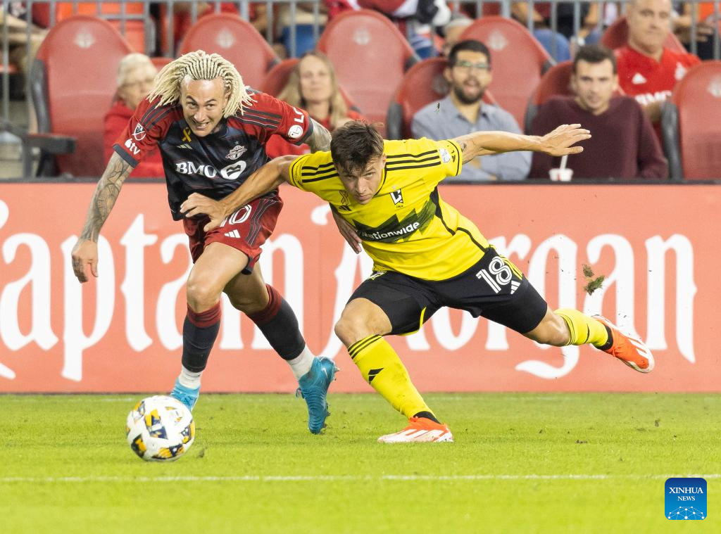 Alonso Coello (R) of Toronto FC vies with Dylan Chambost of Columbus Crew during their 2024 Major League Soccer (MLS) match at BMO Field in Toronto, Canada, on Sept. 18, 2024. (Photo by Zou Zheng/Xinhua)