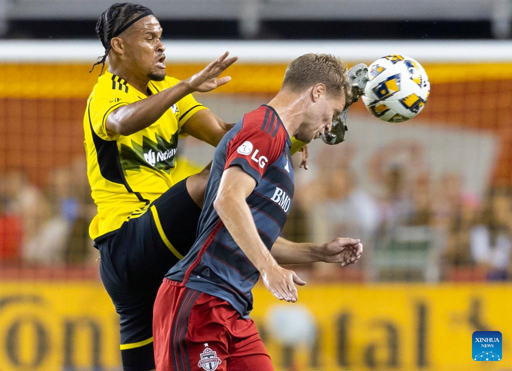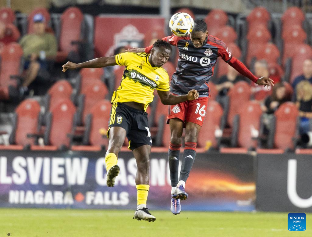 Tyrese Spicer (R) of Toronto FC fights for a header with Yaw Yeboah of Columbus Crew during their 2024 Major League Soccer (MLS) match at BMO Field in Toronto, Canada, on Sept. 18, 2024. (Photo by Zou Zheng/Xinhua)