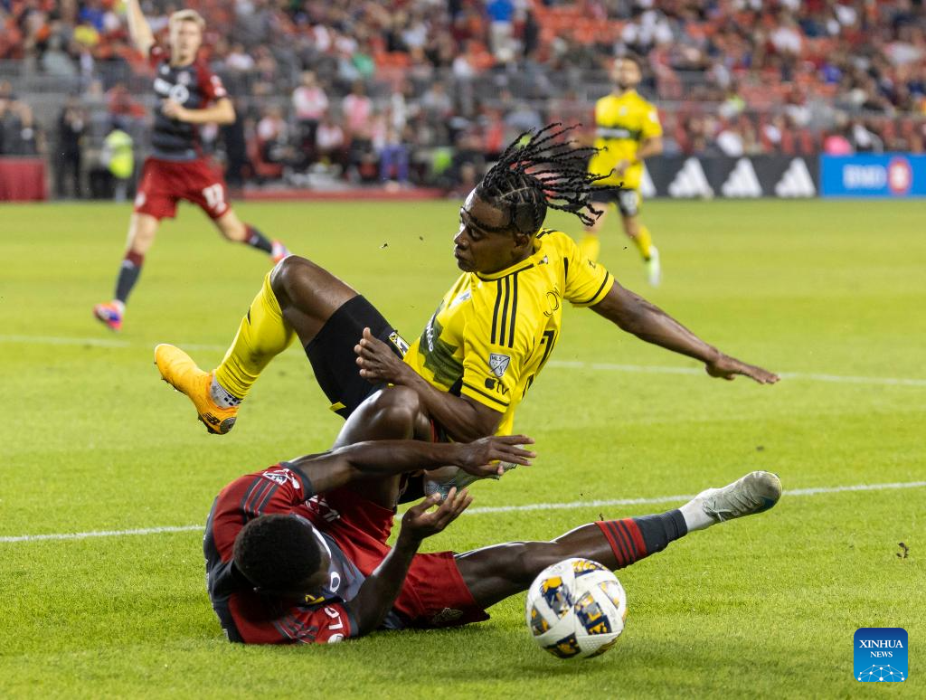 Richie Laryea (Bottom) of Toronto FC vies with DeJuan Jones of Columbus Crew during their 2024 Major League Soccer (MLS) match at BMO Field in Toronto, Canada, on Sept. 18, 2024. (Photo by Zou Zheng/Xinhua)