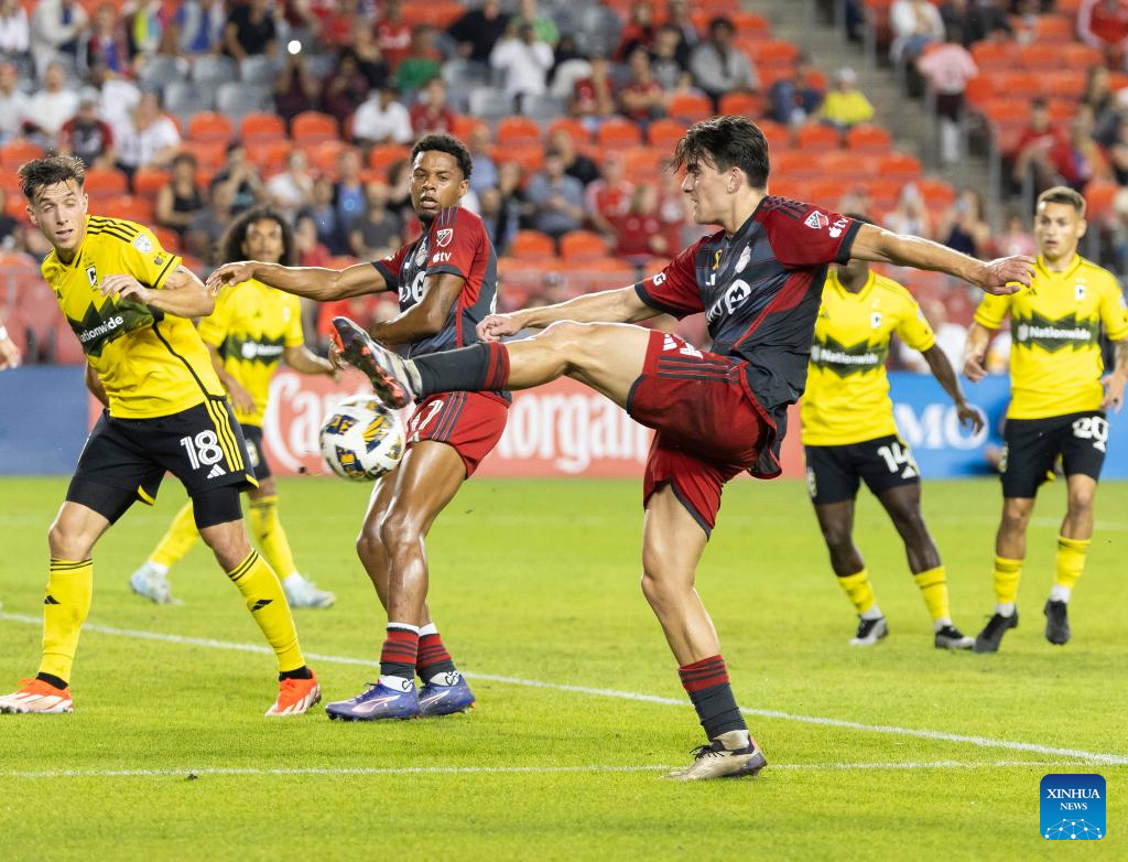 Alonso Coello (Front) of Toronto FC shoots the ball during the 2024 Major League Soccer (MLS) match between Toronto FC and Columbus Crew at BMO Field in Toronto, Canada, on Sept. 18, 2024. (Photo by Zou Zheng/Xinhua)