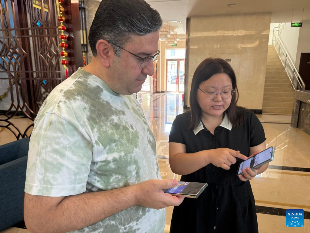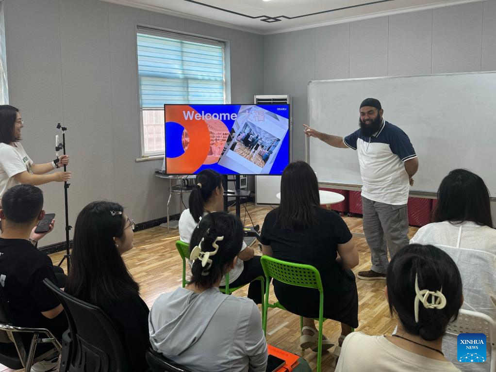 Pakistani trader Hafiz Abubakr shares his experience in doing business with Chinese sales persons at the invitation of Omaska, a company in Baigou new area, north China's Hebei Province on Sept. 6, 2024. (Xinhua/Wang Meiqi)