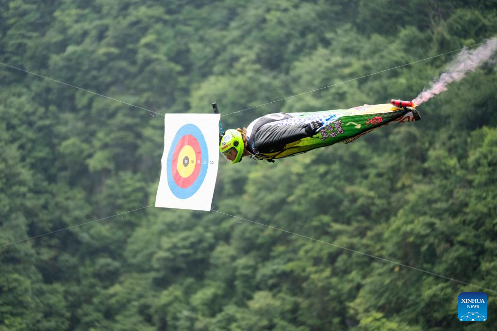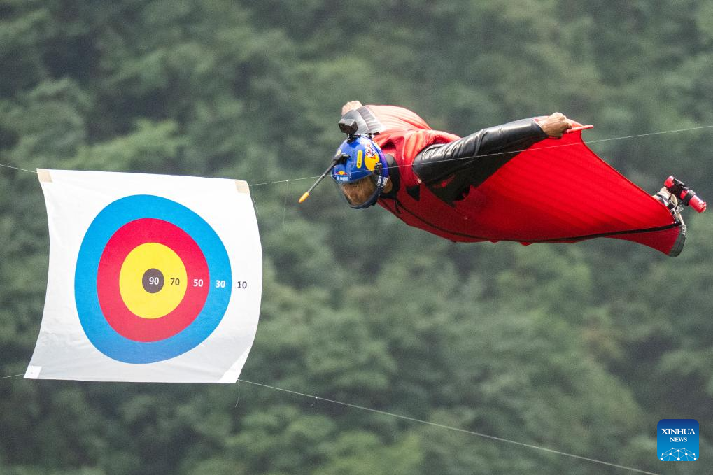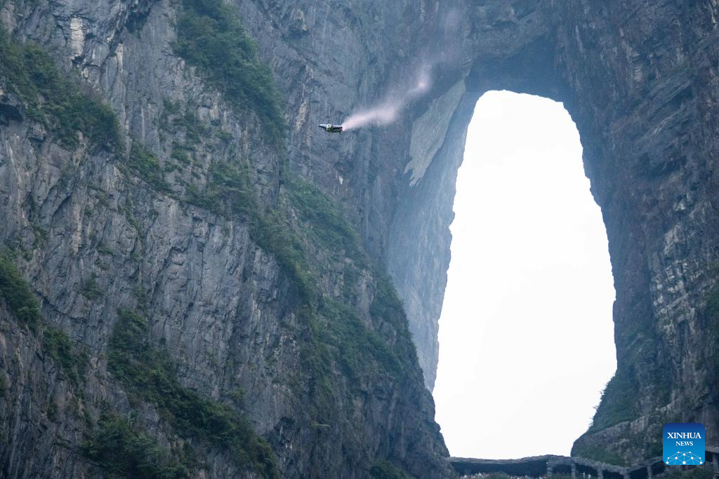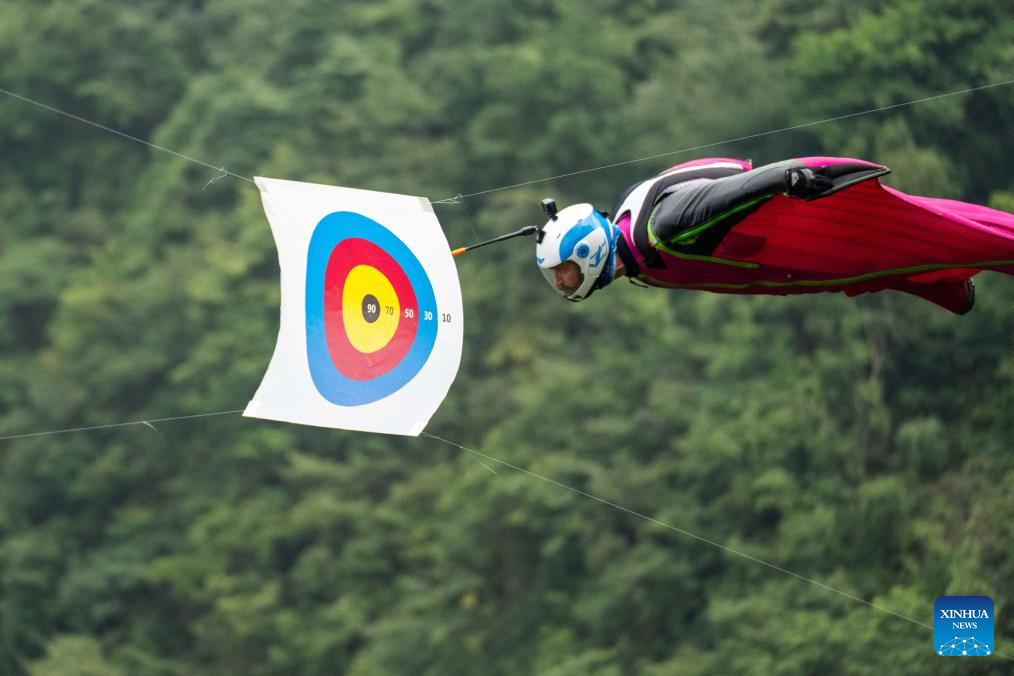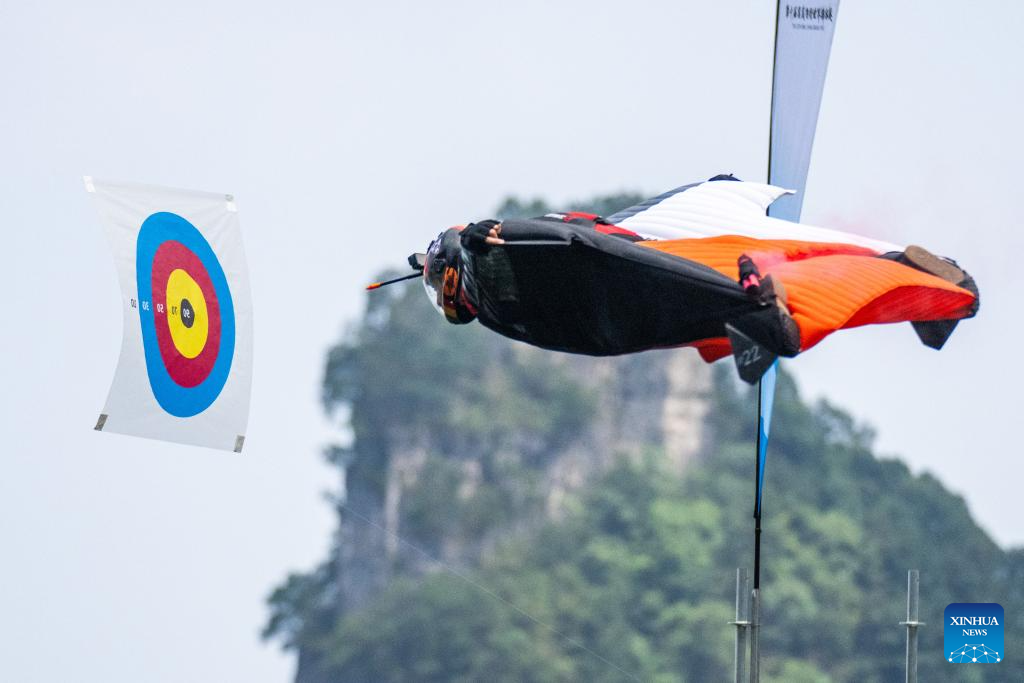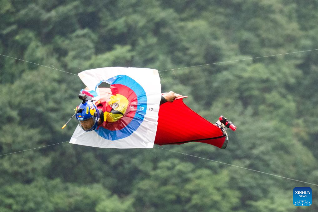 JJ Wallis of South Africa competes during the flying through targets competition at the 10th World Wingsuit League (WWL) Wingsuit Flying World Championship at the Tianmen Mountain National Forest Park in Zhangjiajie, central China's Hunan Province, on Sept. 19, 2024. (Xinhua/Chen Sihan)