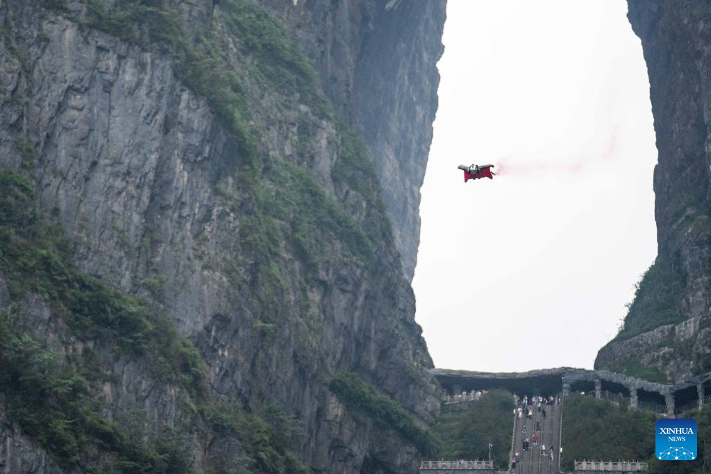 Zhang Shupeng of China competes during the flying through targets competition at the 10th World Wingsuit League (WWL) Wingsuit Flying World Championship at the Tianmen Mountain National Forest Park in Zhangjiajie, central China's Hunan Province, on Sept. 19, 2024. (Xinhua/Chen Sihan)