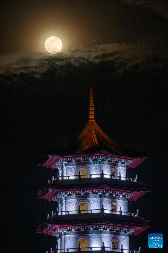 A supermoon rises above the Cloud Pagoda in Jurong Lake Gardens, Singapore, Sept. 18, 2024. (Photo by Then Chih Wey/Xinhua)