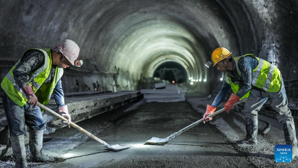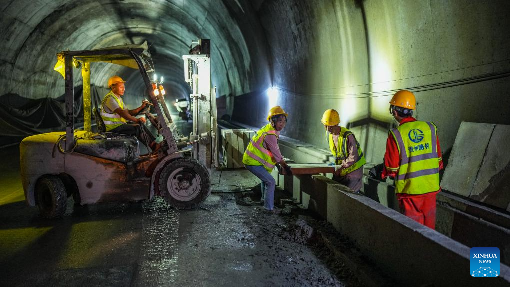 Workers operate at Zimuyan tunnel along the Wulong-Daozhen highway in southwest China's Guizhou Province, Sept. 19, 2024. The construction in both directions of the 7,407-meter-long Zimuyan tunnel, part of the Wulong-Daozhen highway, has been completed on Thursday. (Xinhua/Tao Liang)