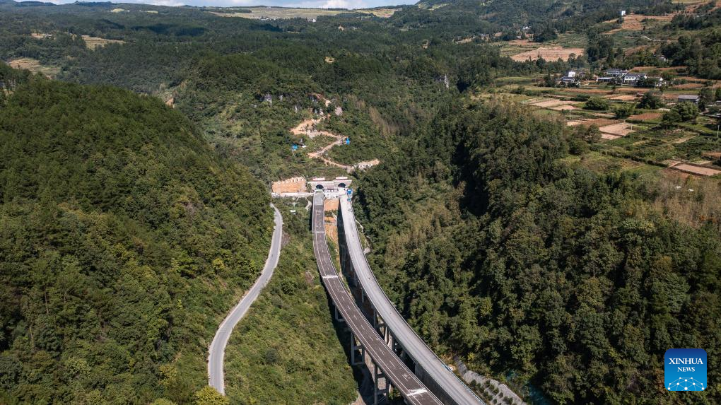 An aerial drone photo taken on Sept. 19, 2024 shows a view of Zimuyan tunnel along the Wulong-Daozhen highway in southwest China's Guizhou Province. The construction in both directions of the 7,407-meter-long Zimuyan tunnel, part of the Wulong-Daozhen highway, has been completed on Thursday. (Xinhua/Tao Liang)