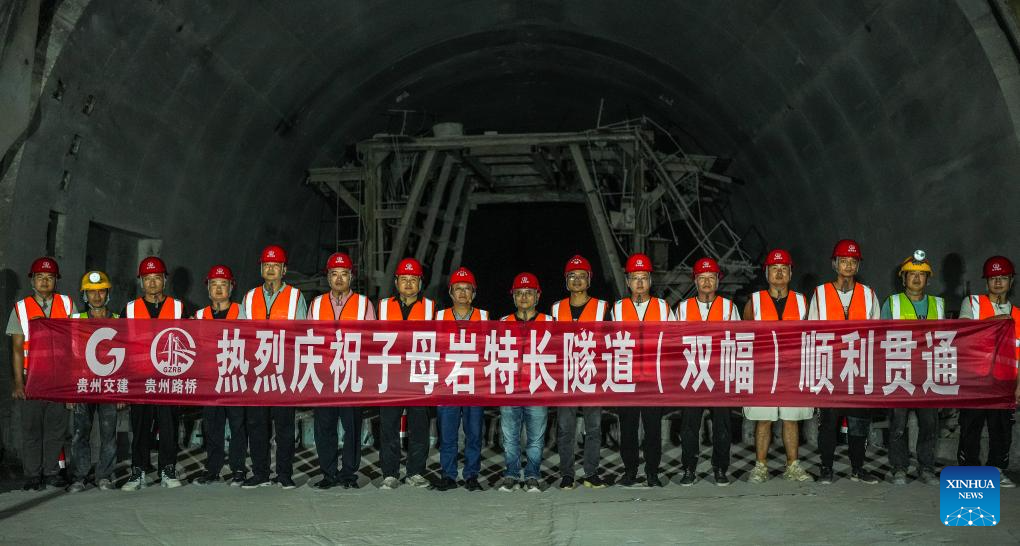 Workers celebrate the completion of construction in both directions of Zimuyan tunnel along the Wulong-Daozhen highway in southwest China's Guizhou Province, Sept. 19, 2024. The construction in both directions of the 7,407-meter-long Zimuyan tunnel, part of the Wulong-Daozhen highway, has been completed on Thursday. (Xinhua/Tao Liang)