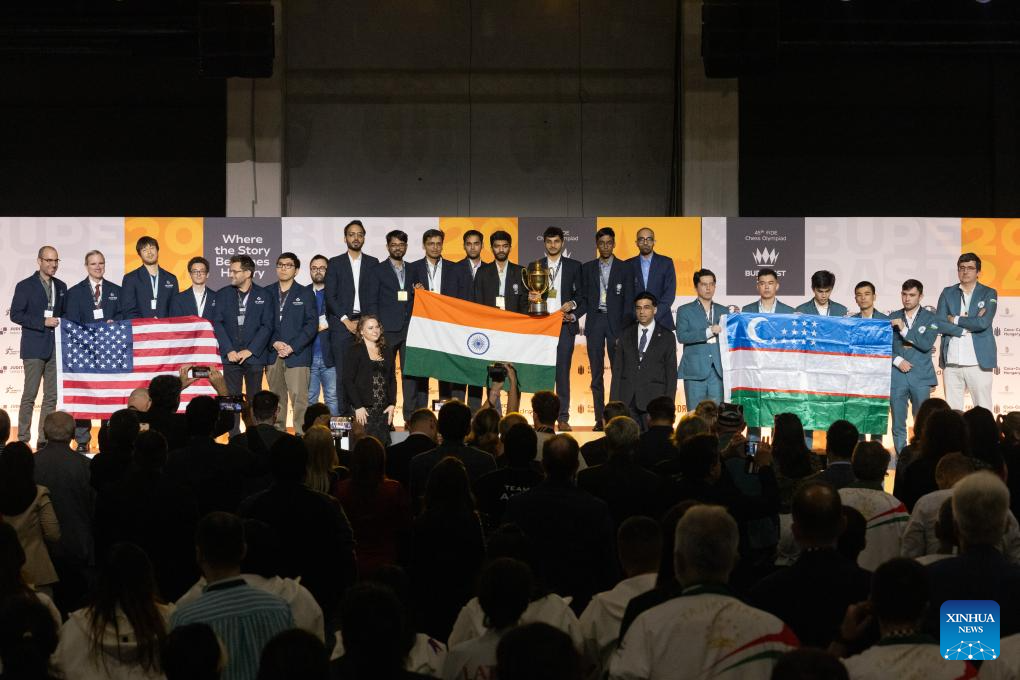 Members of gold medalist team India (C), silver medalist team USA (L), and bronze medalist Uzbekistan celebrate at the awards ceremony of the Men's category of the 45th FIDE Chess Olympiad Budapest 2024 in Budapest, Hungary on Sept. 22, 2024. (Photo by Attila Volgyi/Xinhua)
