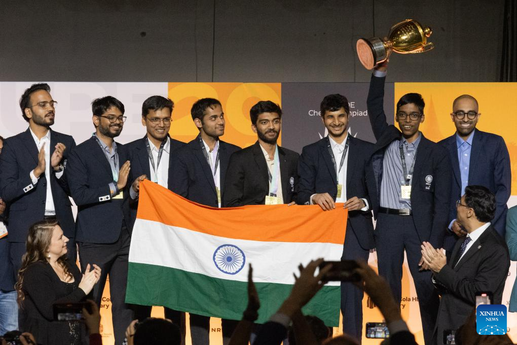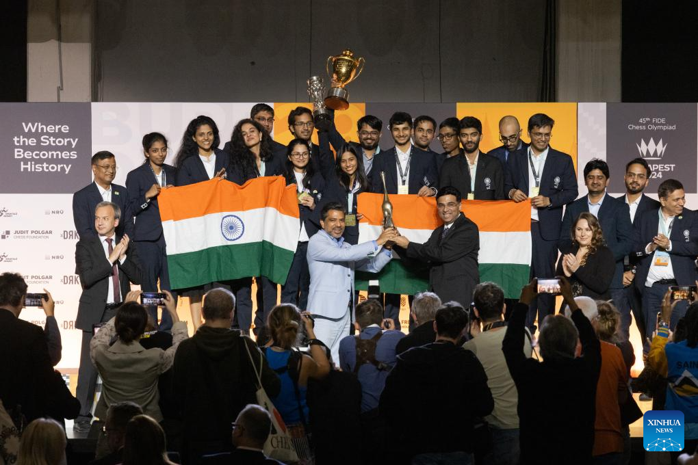 Members of gold medalist team India celebrate their victory at the awards ceremony of the 45th FIDE Chess Olympiad Budapest 2024 in Budapest, Hungary on Sept. 22, 2024. (Photo by Attila Volgyi/Xinhua)
