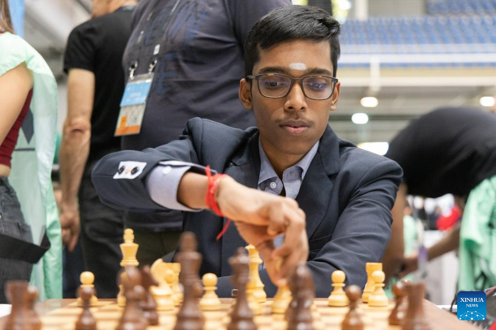 Praggnanandhaa R of India competes during round 11 of the Men's category of the 45th FIDE Chess Olympiad Budapest 2024 in Budapest, Hungary on Sept. 22, 2024. (Photo by Attila Volgyi/Xinhua)
