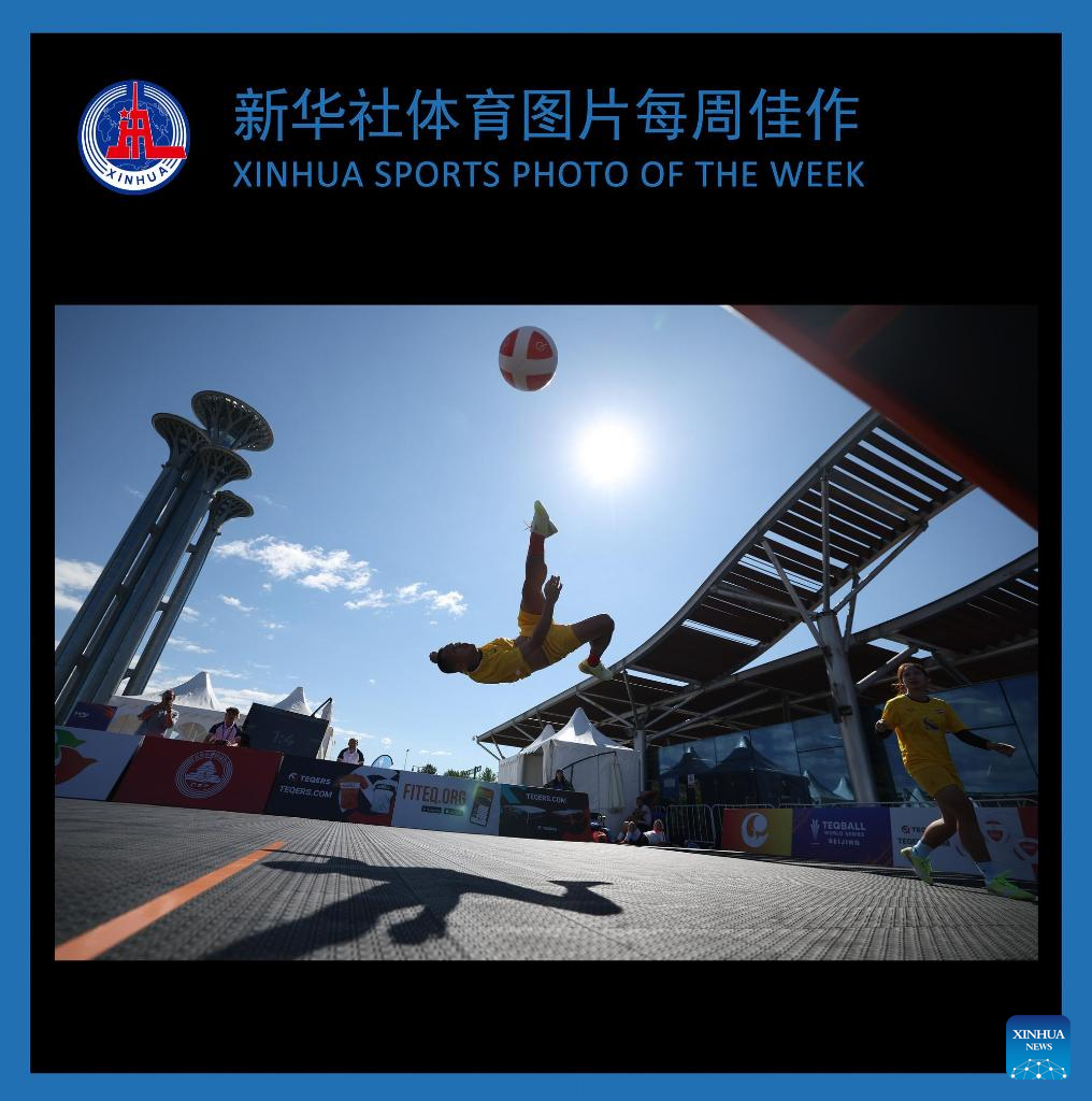 Sorrasak Thaosiri (L)/Areeya Homdee of Thailand compete during the mixed doubles round of 16 match against Gabriella Kota/Balazs Katz of Hungary at the 2024 Teqball World Series Beijing in Beijing, capital of China, Sept. 21, 2024. (Xinhua/Li Ming)