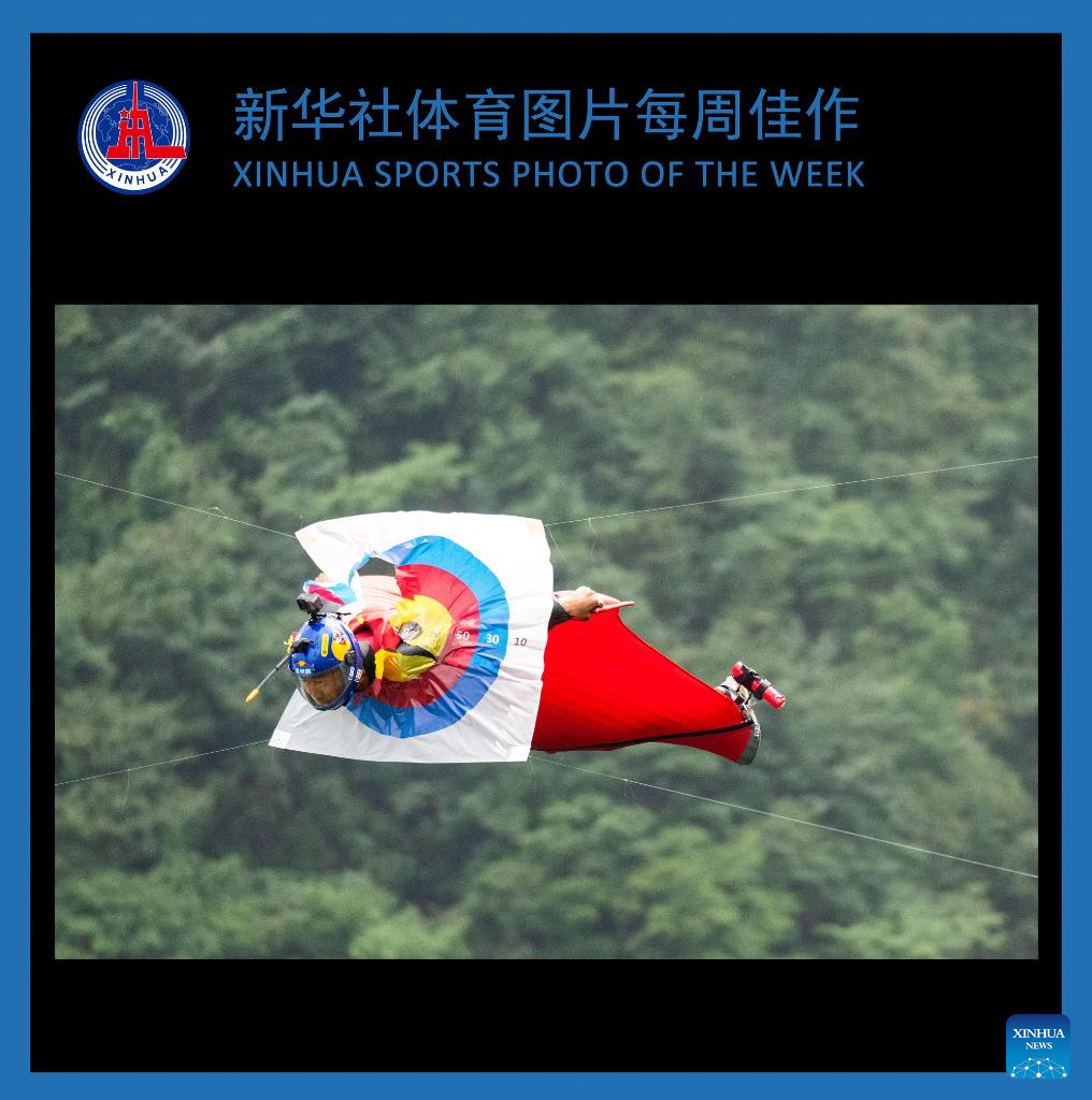 Zhang Shupeng of China competes during the flying through targets competition at the 10th World Wingsuit League (WWL) Wingsuit Flying World Championship at the Tianmen Mountain National Forest Park in Zhangjiajie, central China's Hunan Province, Sept. 19, 2024. (Xinhua/Chen Sihan)