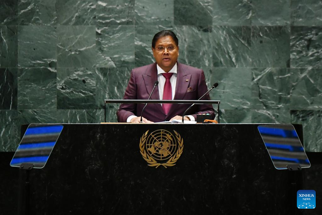 Chandrikapersad Santokhi, president of Suriname, speaks during the Summit of the Future at the UN headquarters in New York, on Sept. 22, 2024. As the Summit of the Future entered its second and final day at the United Nations headquarters in New York on Monday, leaders from the world body's member countries continued to hail the adoption of the Pact for the Future, with Global Digital Compact and Declaration on Future Generations as its annexes. (Xinhua/Li Rui)