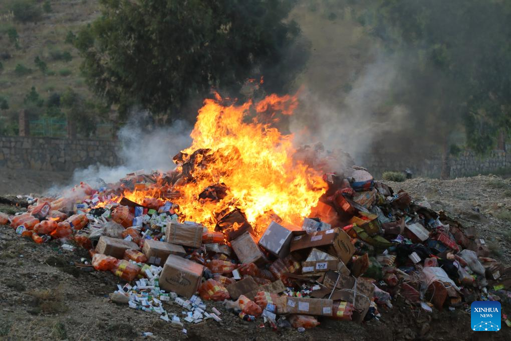 Expired and low-quality medicine and food items are set on fire in eastern Khost province, Afghanistan, Sept. 23, 2024. (Photo by Yusuf Mangal/Xinhua)