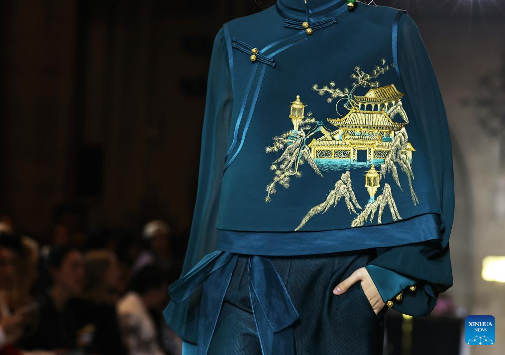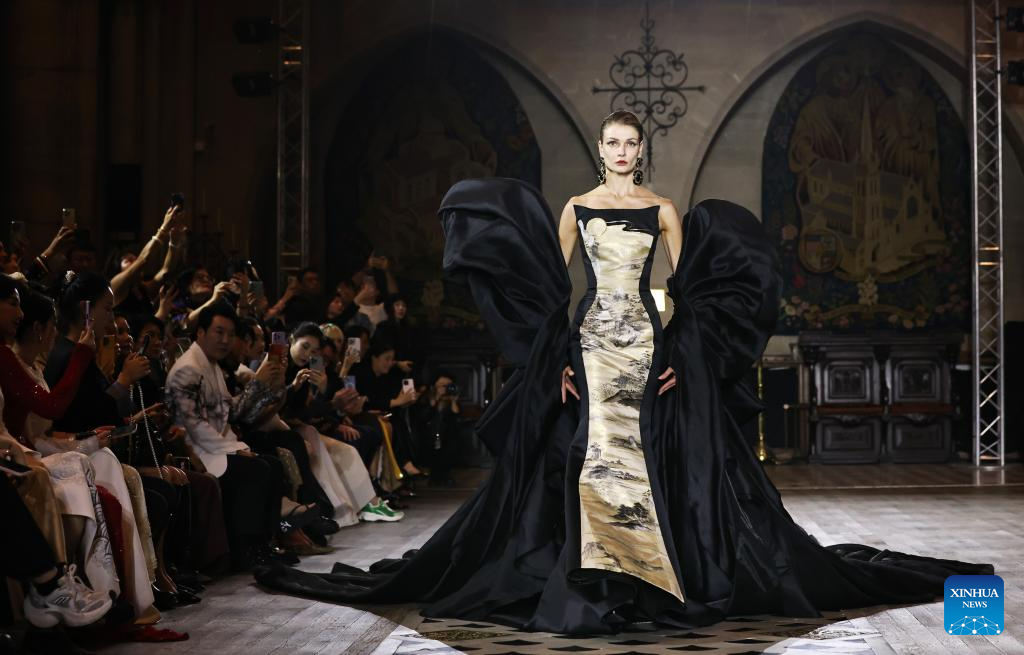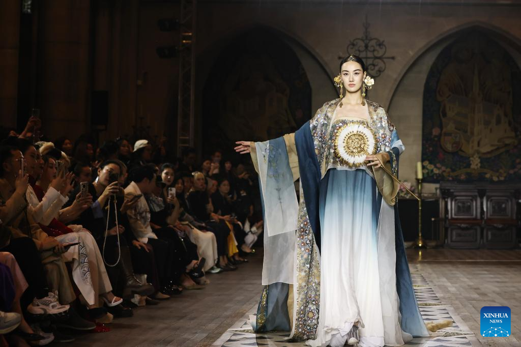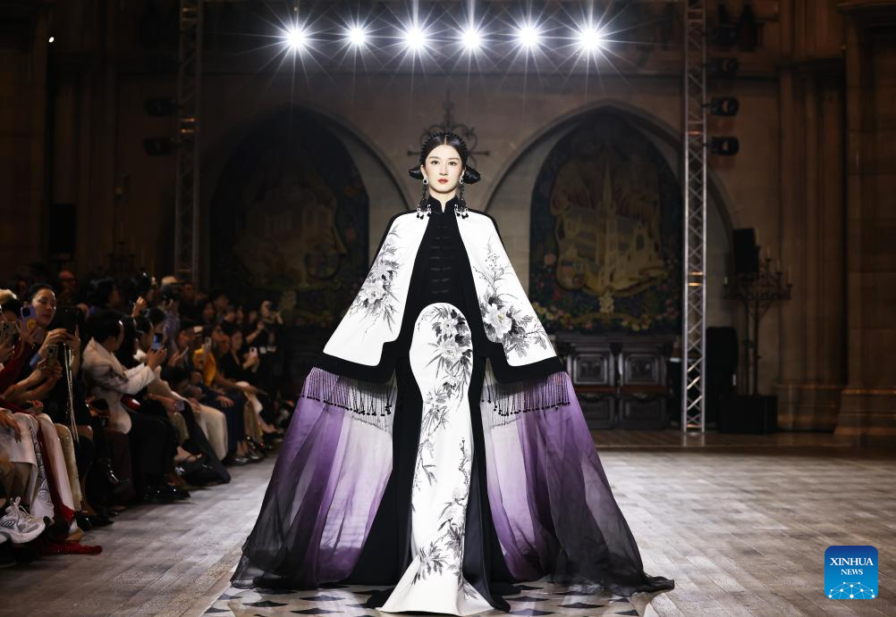 A model presents a creation of the Heaven Gaia Moon Spring/Summer 2025 collections by Chinese fashion designer Xiong Ying during Paris Fashion Week in Paris, France, Sept. 23, 2024. (Xinhua/Gao Jing)