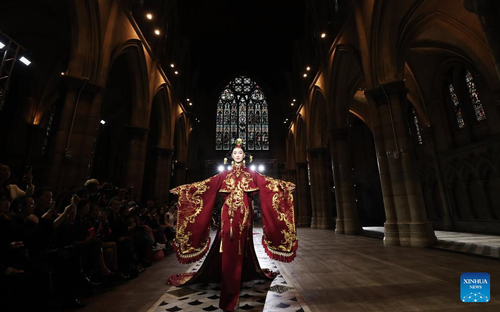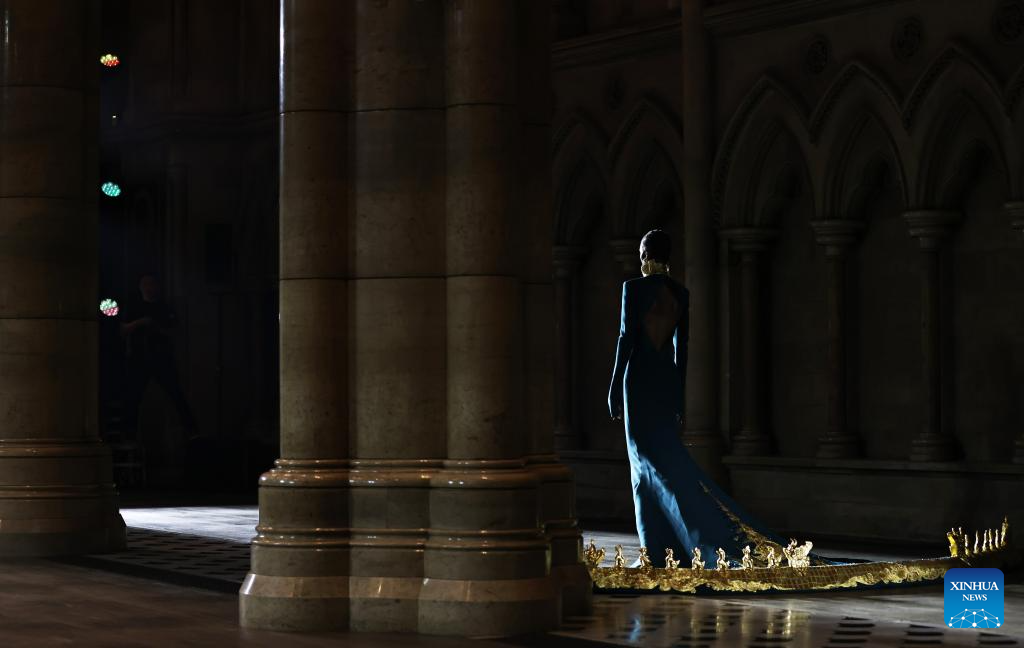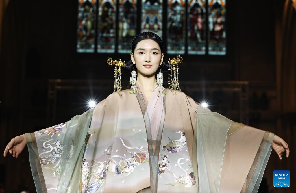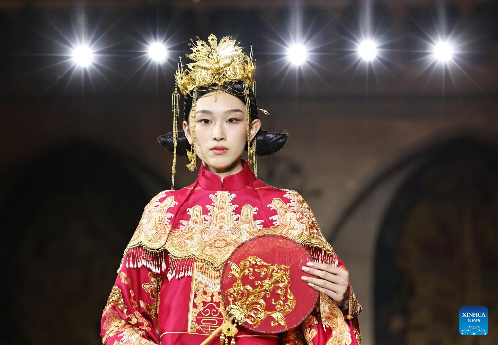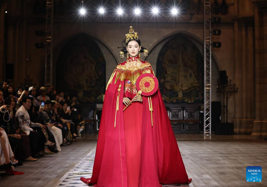 A model presents a creation of the Heaven Gaia Moon Spring/Summer 2025 collections by Chinese fashion designer Xiong Ying during Paris Fashion Week in Paris, France, Sept. 23, 2024. (Xinhua/Gao Jing)
