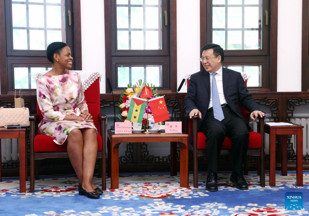 President of Xinhua News Agency Fu Hua meets with Isabel Domingos, Sao Tome and Principe's ambassador to China, in Beijing, capital of China, Sept. 25, 2024. (Xinhua/Ju Peng)