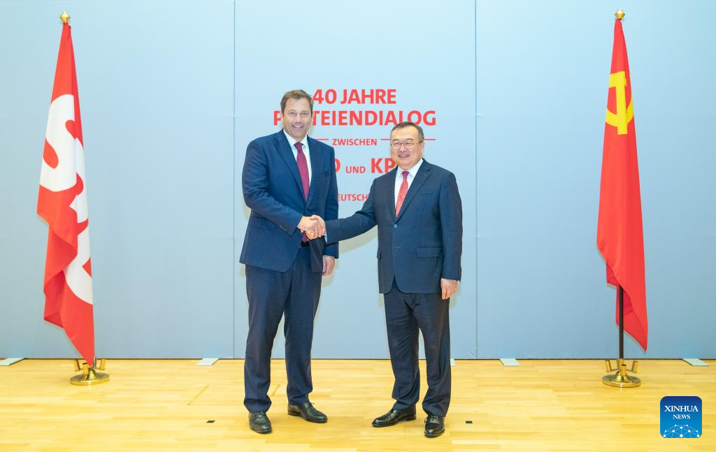Liu Jianchao, head of the International Department of the Communist Party of China (CPC) Central Committee, meets with Lars Klingbeil, co-chair of Germany's Social Democratic Party (SPD), in Berlin, Germany, Sept. 23, 2024. Liu led a CPC delegation on a visit to Germany from Sept. 22 to 25. (Xinhua/Zhang Fan)