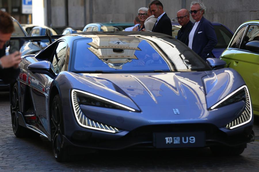 People watch a BYD Yangwang U9 on the 2024 Turin Auto Show in Turin, Italy, Sept. 13, 2024. (Xinhua/Li Jing)Vehicles of Chinese brands are seen on the 2024 Turin Auto Show in Turin, Italy, Sept. 13, 2024. (Xinhua/Li Jing)Vehicles of Chinese brands are seen on the 2024 Turin Auto Show in Turin, Italy, Sept. 13, 2024. (Xinhua/Li Jing)