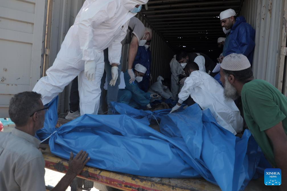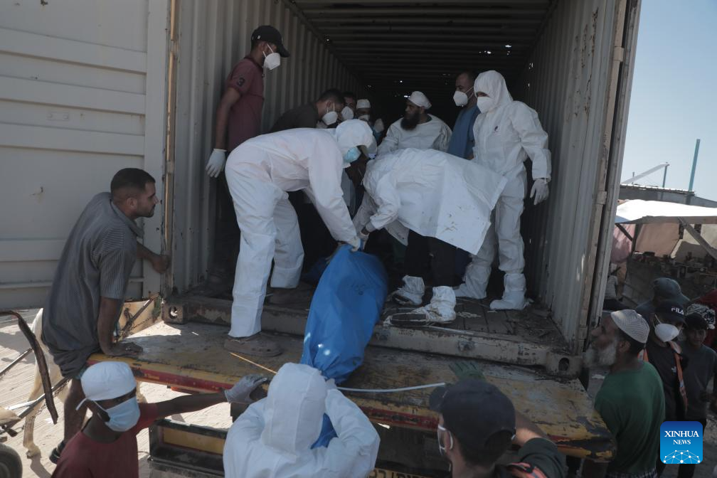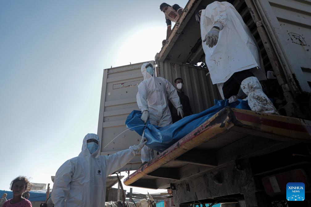 Workers transfer unidentified bodies to a grave in the southern Gaza Strip city of Khan Younis, on Sept. 26, 2024. On Wednesday, the Gaza-based health authorities reported receiving about 88 unidentified bodies from the Israeli side, adding the Israeli side did not provide any information about their identities, the locations where they were recovered, or the time of death. (Photo by Rizek Abdeljawad/Xinhua)