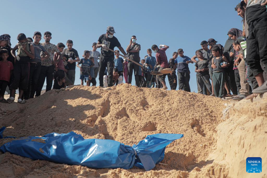 An unidentified body is buried at a grave in the southern Gaza Strip city of Khan Younis, on Sept. 26, 2024. On Wednesday, the Gaza-based health authorities reported receiving about 88 unidentified bodies from the Israeli side, adding the Israeli side did not provide any information about their identities, the locations where they were recovered, or the time of death. (Photo by Rizek Abdeljawad/Xinhua)