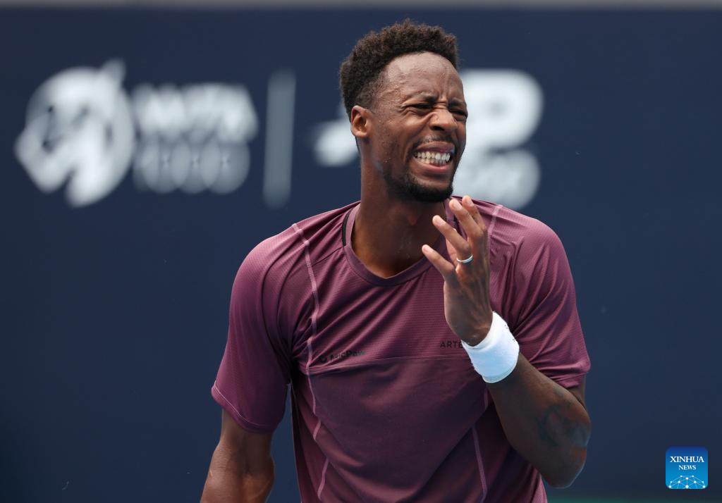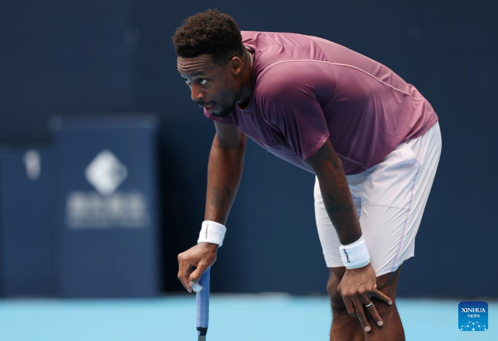 Gael Monfils reacts during the men's singles first round match between Daniil Medvedev of Russia and Gael Monfils of France at 2024 China Open tennis tournament in Beijing, capital of China, Sept. 27, 2024. (Xinhua/Zhang Chenlin)