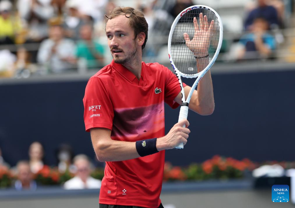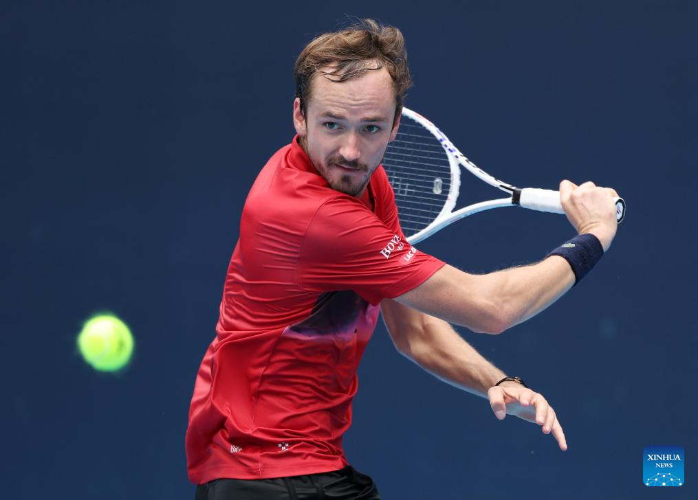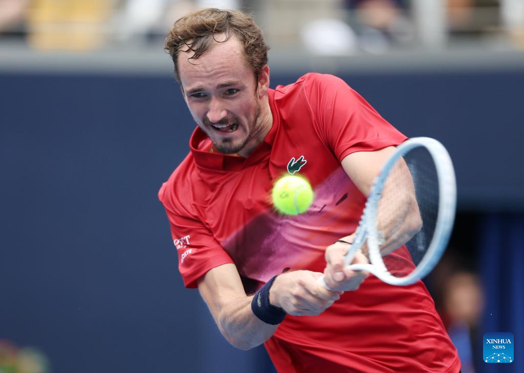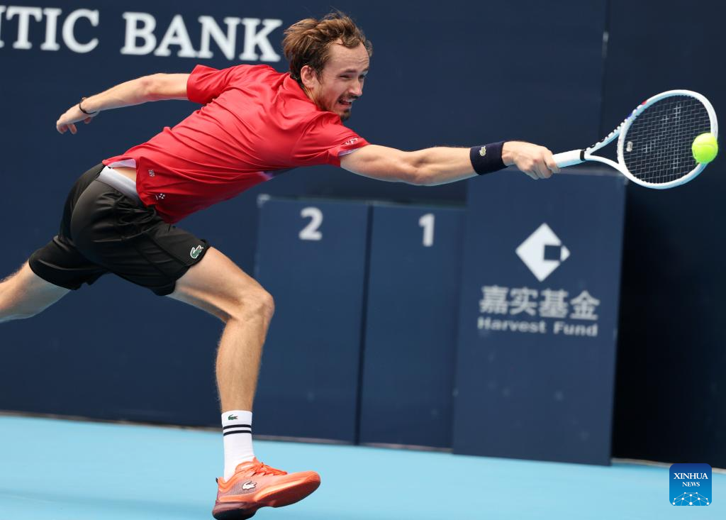 Daniil Medvedev hits a return during the men's singles first round match between Daniil Medvedev of Russia and Gael Monfils of France at 2024 China Open tennis tournament in Beijing, capital of China, Sept. 27, 2024. (Xinhua/Zhang Chenlin)