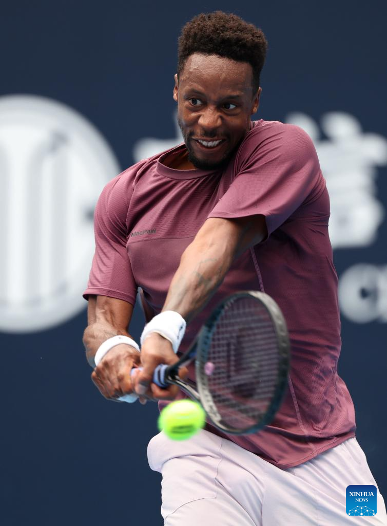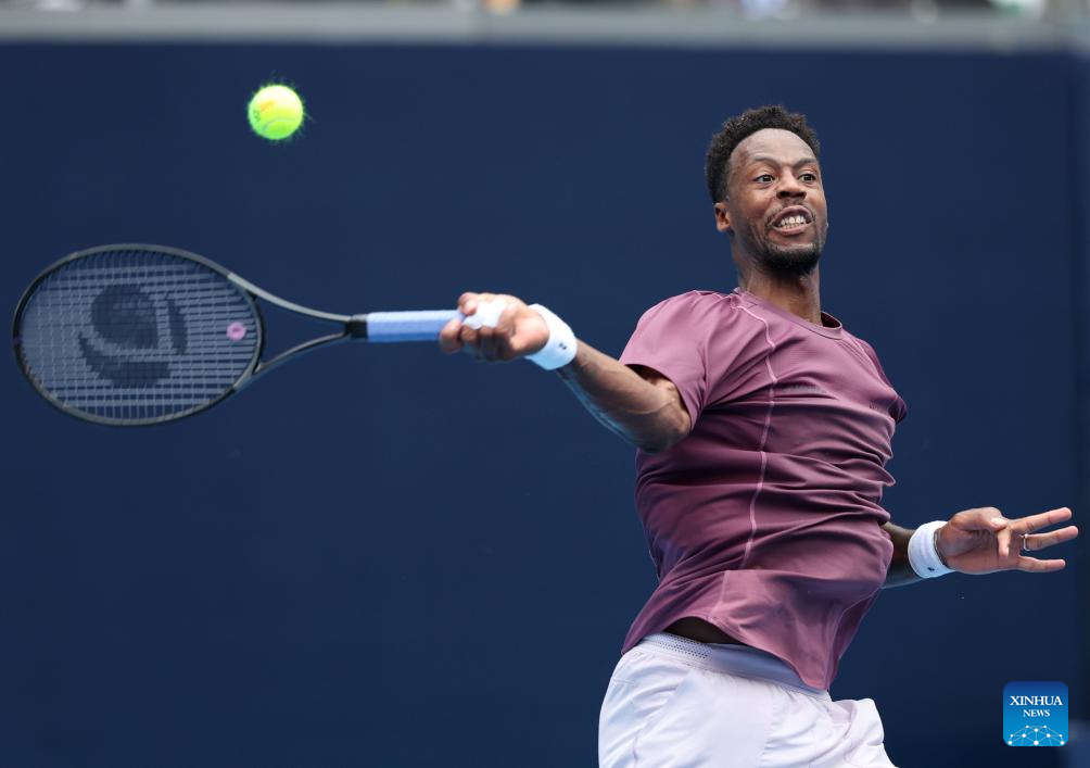 Gael Monfils hits a return during the men's singles first round match between Daniil Medvedev of Russia and Gael Monfils of France at 2024 China Open tennis tournament in Beijing, capital of China, Sept. 27, 2024. (Xinhua/Zhang Chenlin)