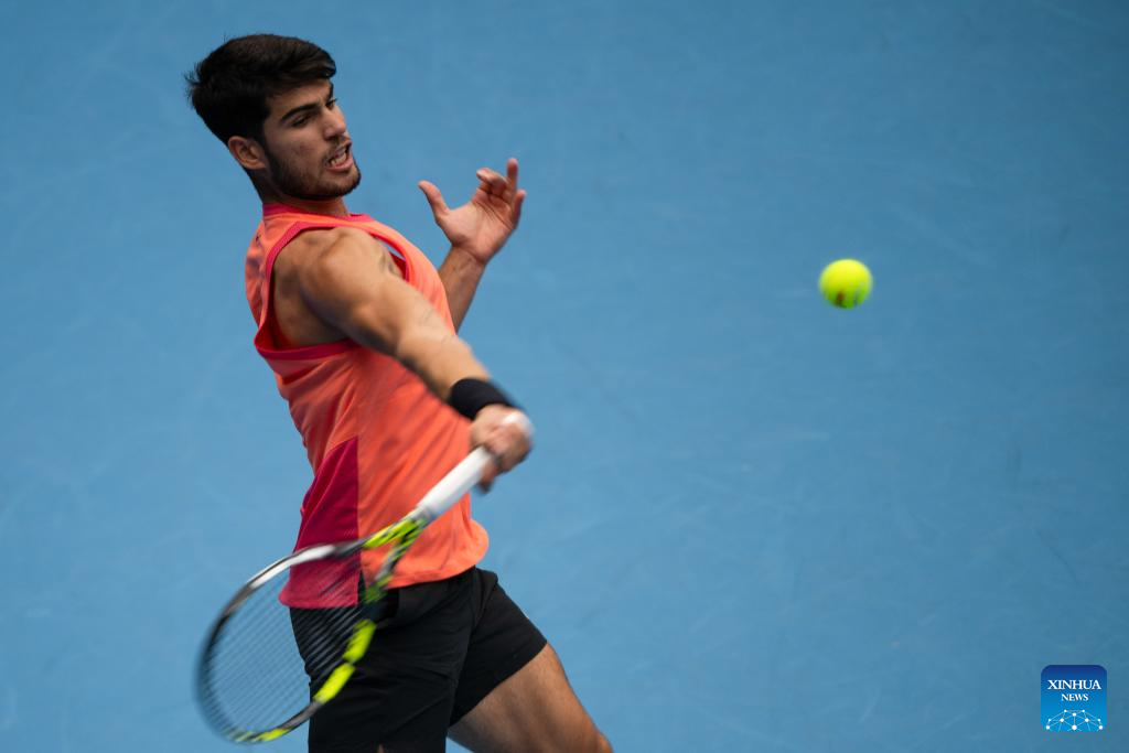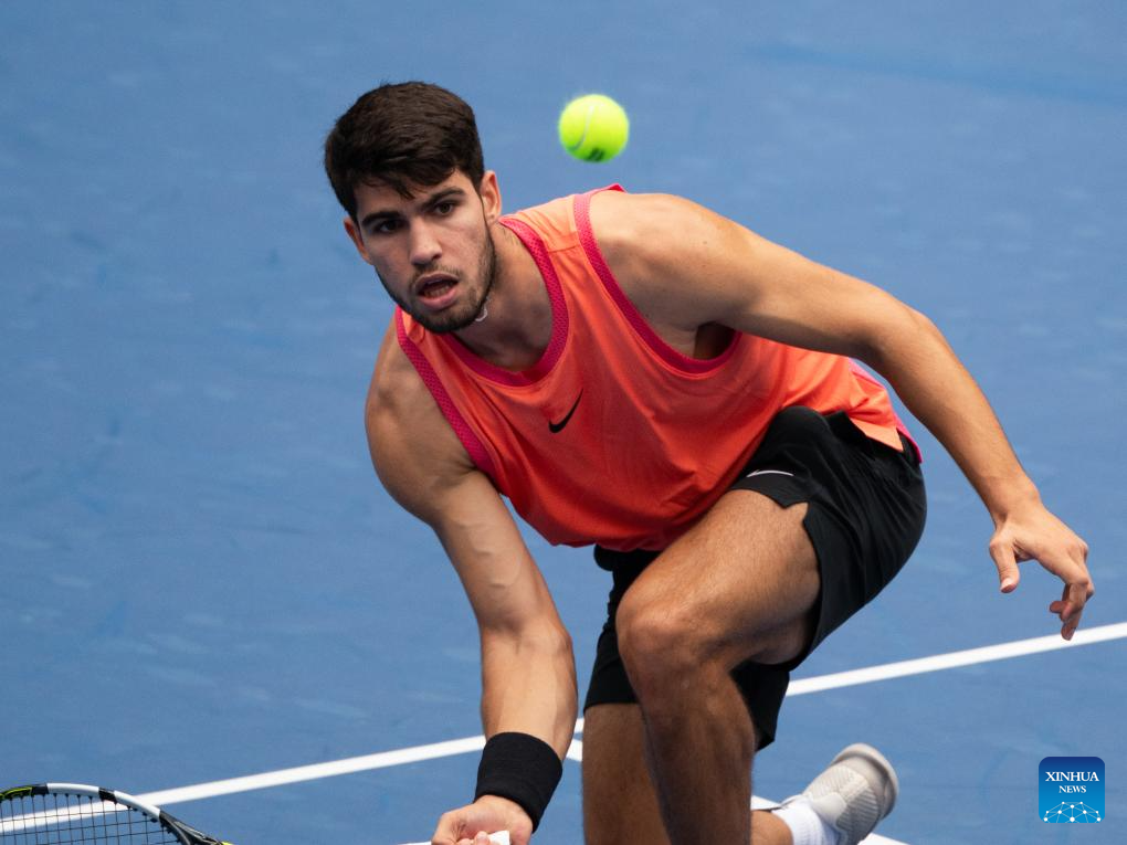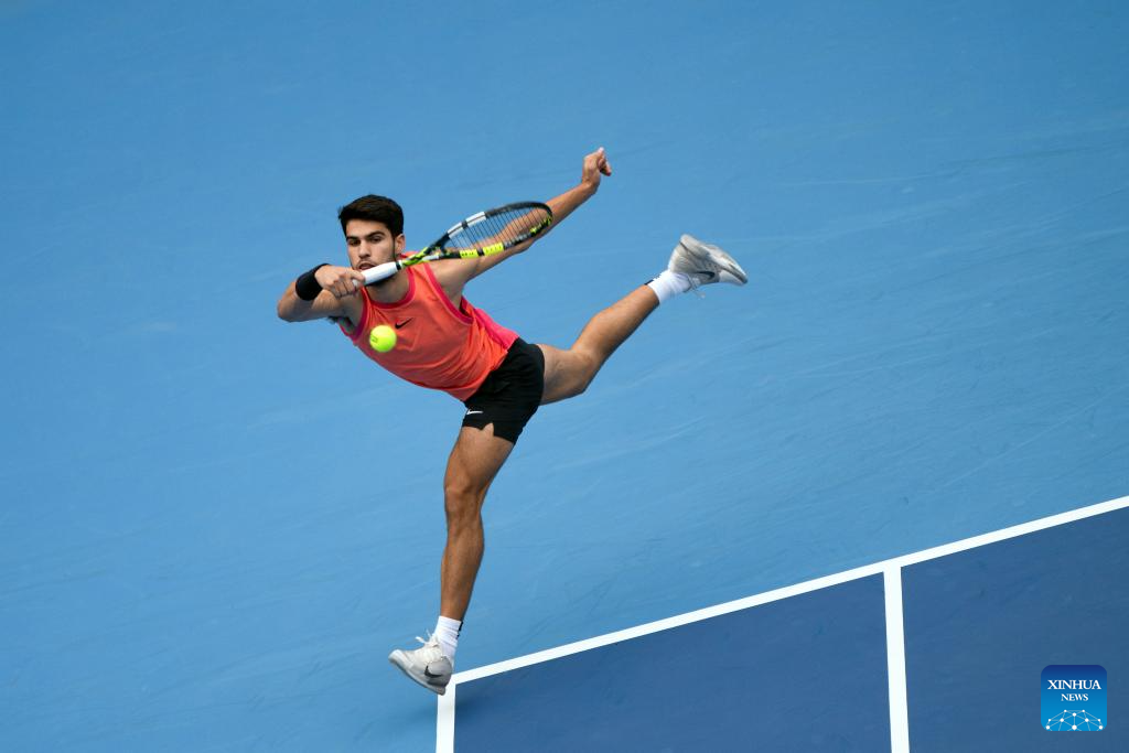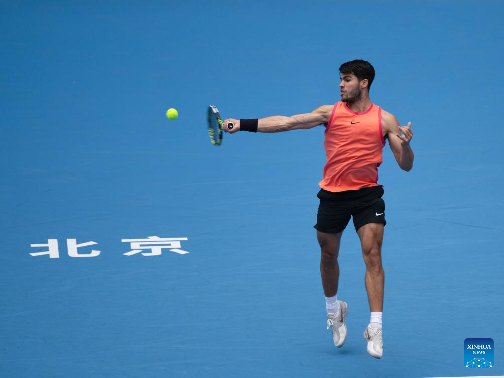 Carlos Alcaraz hits a return during the men's singles first round match between Carlos Alcaraz of Spain and Giovanni Mpetshi Perricard of France at 2024 China Open tennis tournament in Beijing, capital of China, Sept. 27, 2024. (Xinhua/Zhang Long)