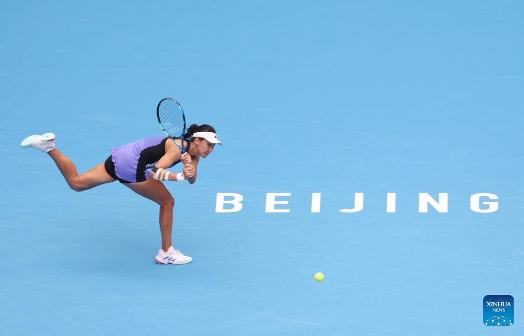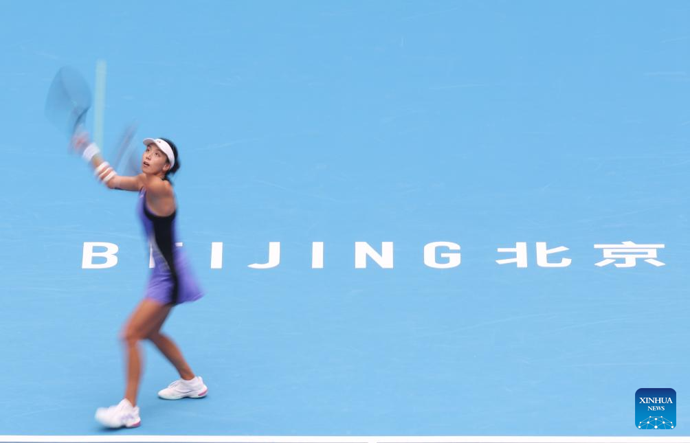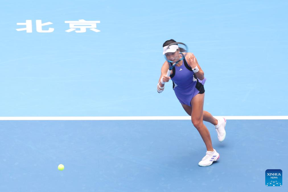 Wang Xinyu hits a return during the women's singles second round match between Wang Xinyu of China and Veronika Kudermetova of Russia at 2024 China Open tennis tournament in Beijing, capital of China, Sept. 27, 2024. (Xinhua/Bai Xuefei)