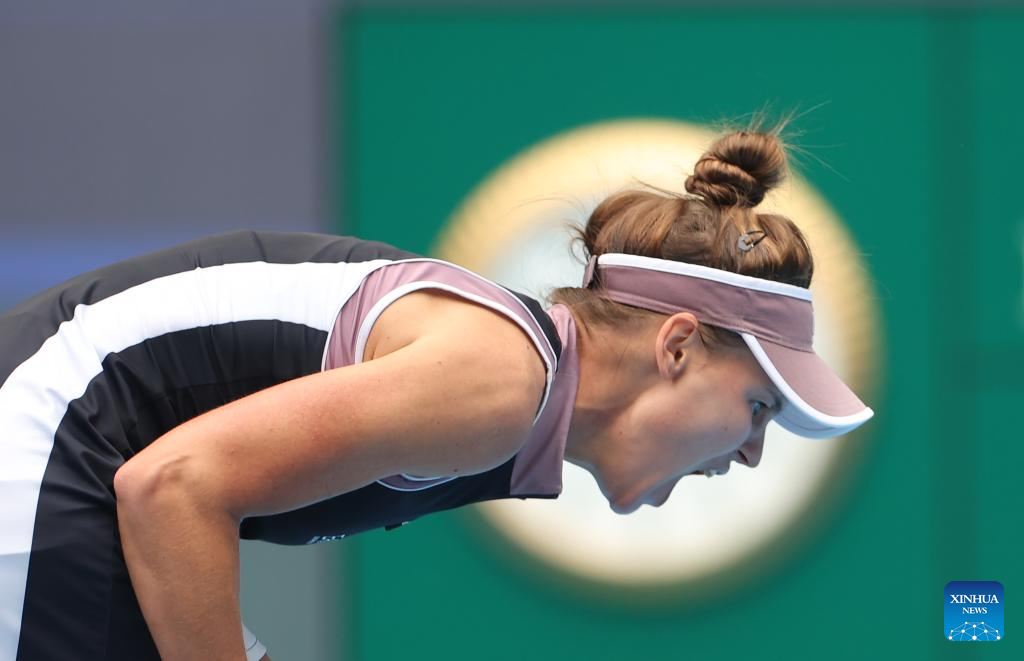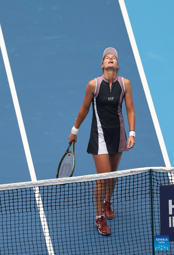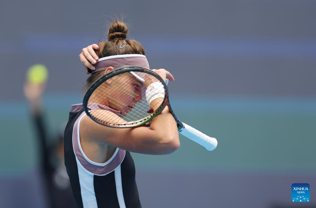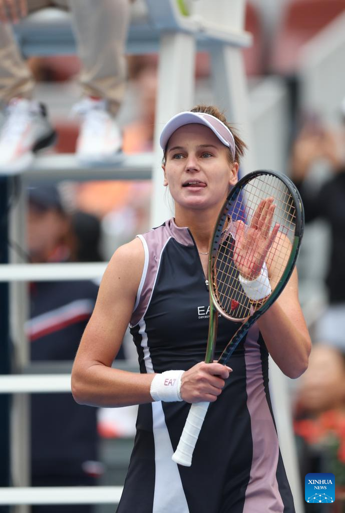 Veronika Kudermetova reacts during the women's singles second round match between Wang Xinyu of China and Veronika Kudermetova of Russia at 2024 China Open tennis tournament in Beijing, capital of China, Sept. 27, 2024. (Xinhua/Bai Xuefei)