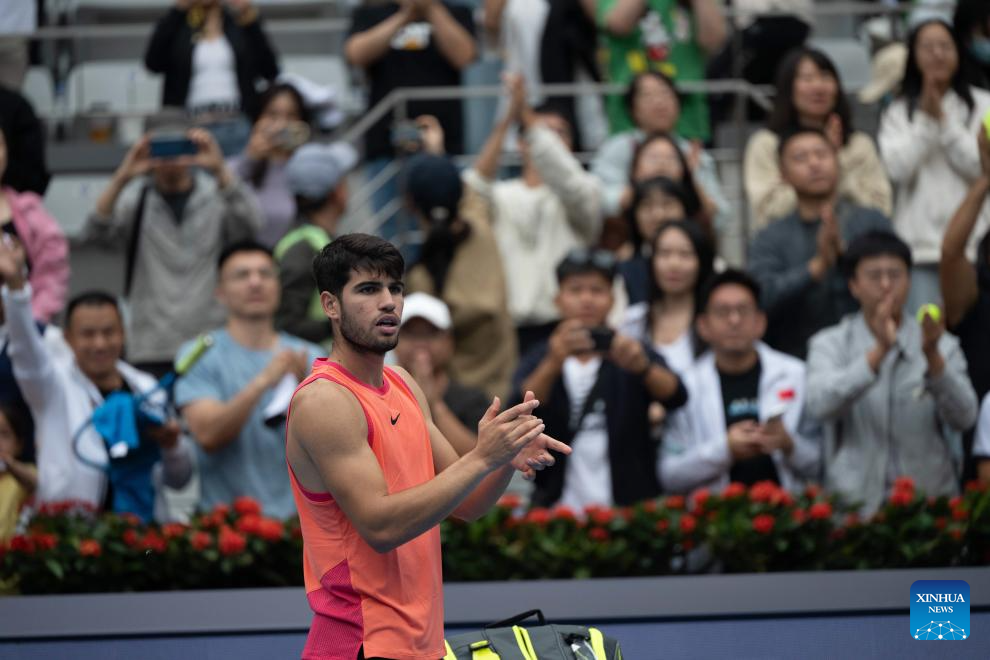 Carlos Alcaraz reacts after winning during the men's singles first round match between Carlos Alcaraz of Spain and Giovanni Mpetshi Perricard of France at 2024 China Open tennis tournament in Beijing, capital of China, Sept. 27, 2024. (Xinhua/Zhang Long)