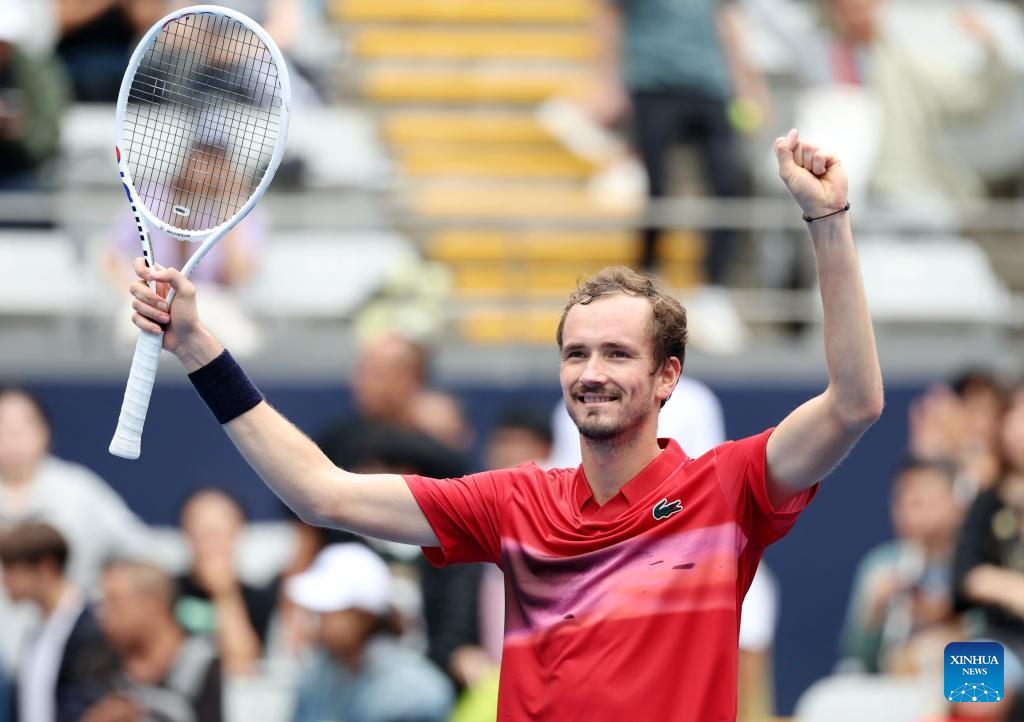 Daniil Medvedev celebrates victory after the men's singles first round match between Daniil Medvedev of Russia and Gael Monfils of France at 2024 China Open tennis tournament in Beijing, capital of China, Sept. 27, 2024. (Xinhua/Zhang Chenlin)