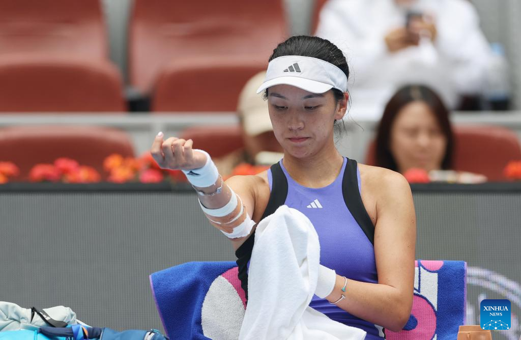 Wang Xinyu checks her arm during the women's singles second round match between Wang Xinyu of China and Veronika Kudermetova of Russia at 2024 China Open tennis tournament in Beijing, capital of China, Sept. 27, 2024. (Xinhua/Bai Xuefei)