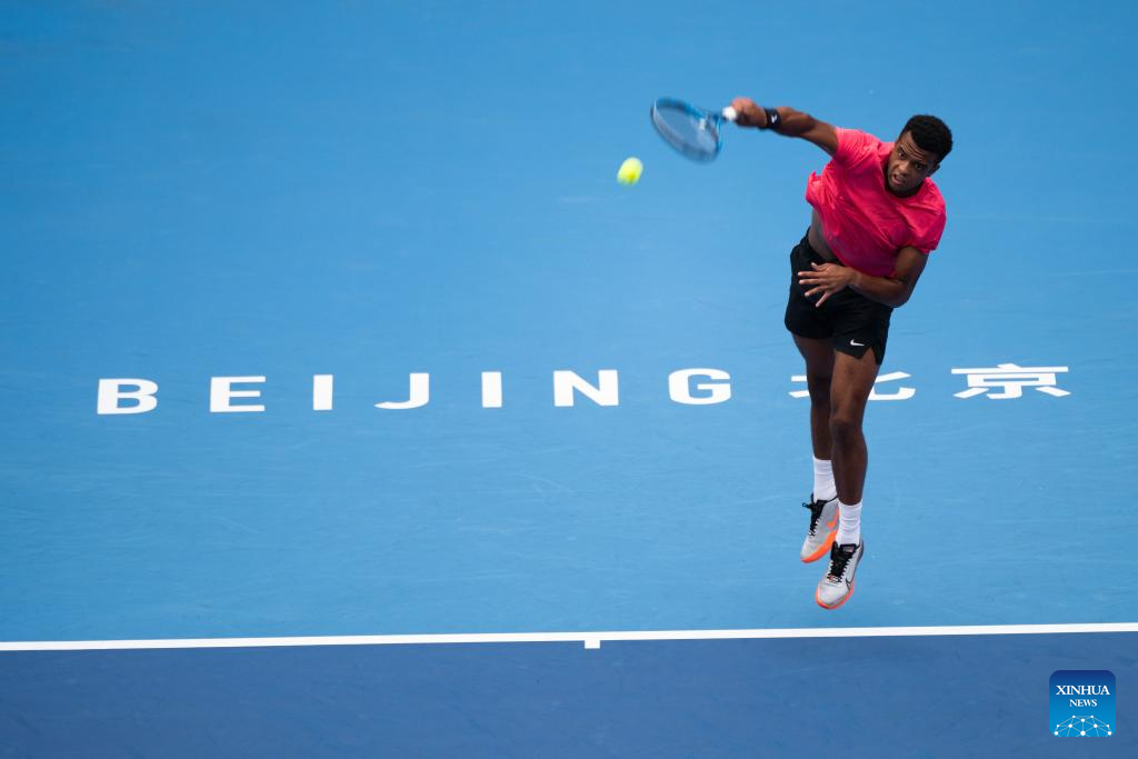 Giovanni Mpetshi Perricard hits a return during the men's singles first round match between Carlos Alcaraz of Spain and Giovanni Mpetshi Perricard of France at 2024 China Open tennis tournament in Beijing, capital of China, Sept. 27, 2024. (Xinhua/Zhang Long)