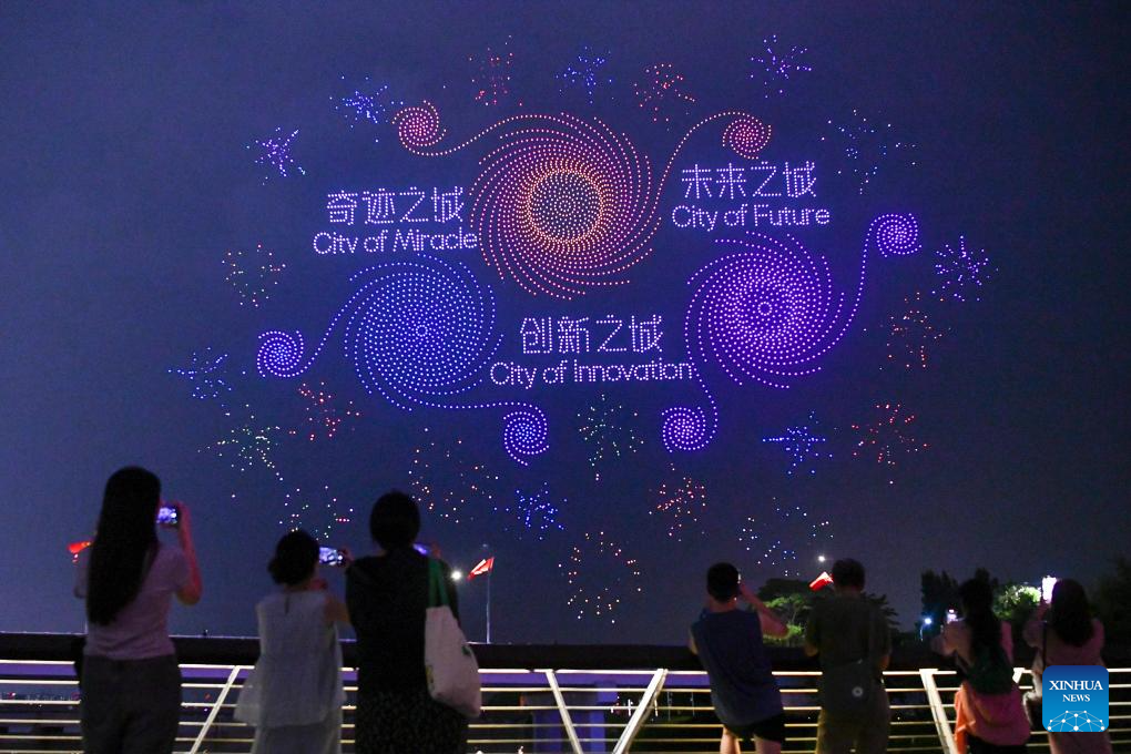 People enjoy a drone show at a park in Shenzhen, south China's Guangdong Province, Sept. 26, 2024. (Xinhua/Liang Xu)