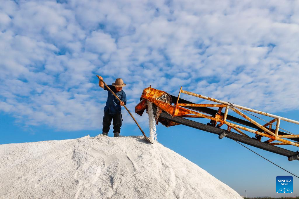 A worker is seen busy on top of a salt stack at Daqinghe salt fields in Tangshan, north China's Hebei Province, Sept. 26, 2024. (Photo by Liu Mancang/Xinhua)