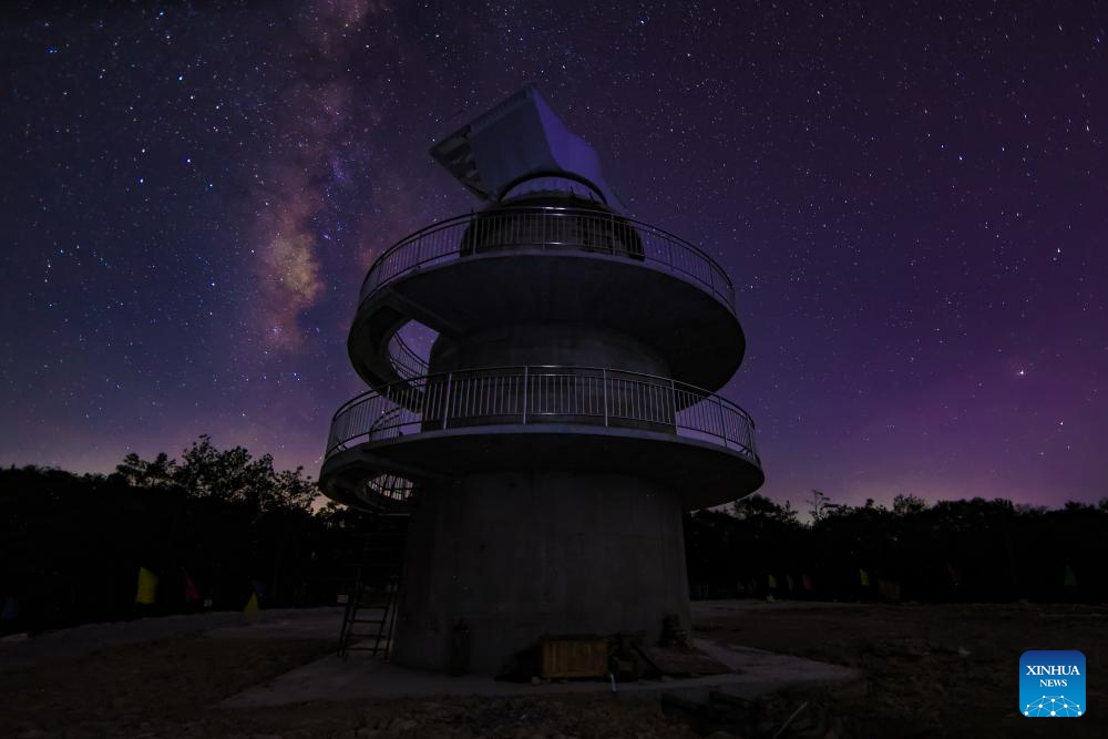 This photo taken on Sept. 25, 2024 shows the newly installed first test prototype of the Core Array of China's Five-hundred-meter Aperture Spherical Radio Telescope under the starry sky in southwest China's Guizhou Province.