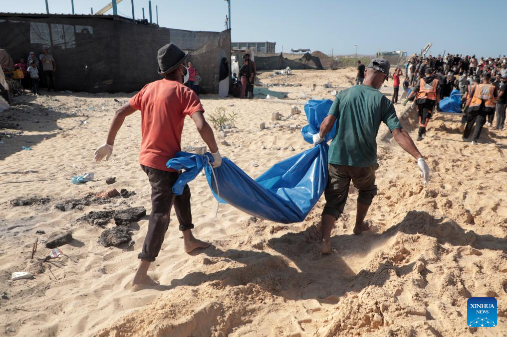 People transfer unidentified bodies to a grave in the southern Gaza Strip city of Khan Younis, on Sept. 26, 2024. On Wednesday, the Gaza-based health authorities reported receiving about 88 unidentified bodies from the Israeli side, adding the Israeli side did not provide any information about their identities, the locations where they were recovered, or the time of death. (Photo by Rizek Abdeljawad/Xinhua)