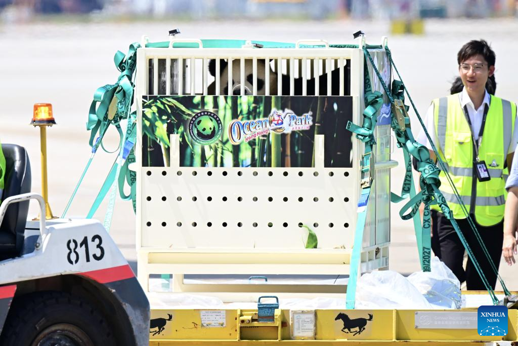 Giant panda An An is unloaded from the plane at the Hong Kong International Airport in Hong Kong, south China, Sept. 26, 2024. A pair of giant pandas gifted by the central government to the Hong Kong Special Administrative Region (HKSAR) of China arrived at the Hong Kong International Airport on Thursday morning.
