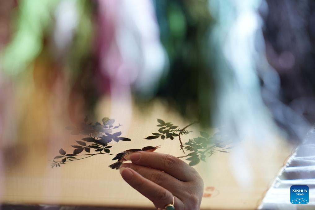 Lu Jianying, an inheritor of Suzhou embroidery, embroiders an intricate image of leaves at a Suzhou embroidery training studio in Suzhou, east China's Jiangsu Province, Sept. 25, 2024. Born to a family specializing in the Suzhou embroidery craft, Lu began learning basic embroidery skills from her grandmother when she was eight, and has now been making embroidery for more than 30 years.