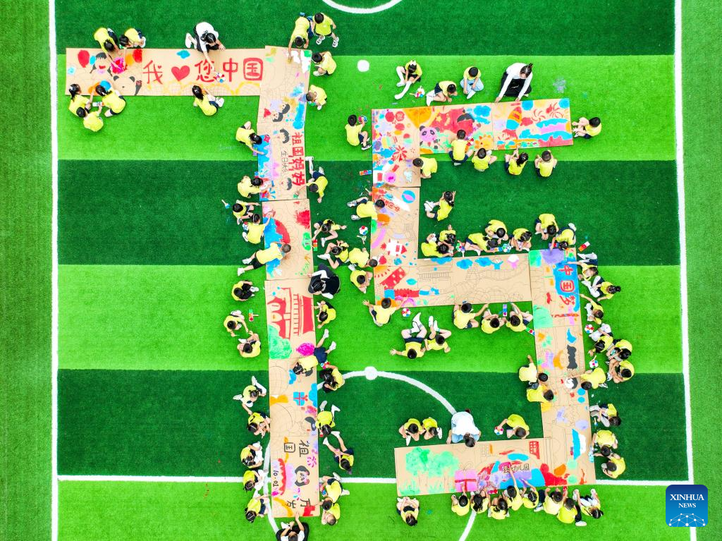 An aerial drone photo taken on Sept. 26, 2024 shows kids jointly creating a painting commemorating the upcoming 75th anniversary of the founding of the People's Republic of China at a kindergarten in Tonggu County of Yichun City, east China's Jiangxi Province. (Photo by Zhou Liang/Xinhua)