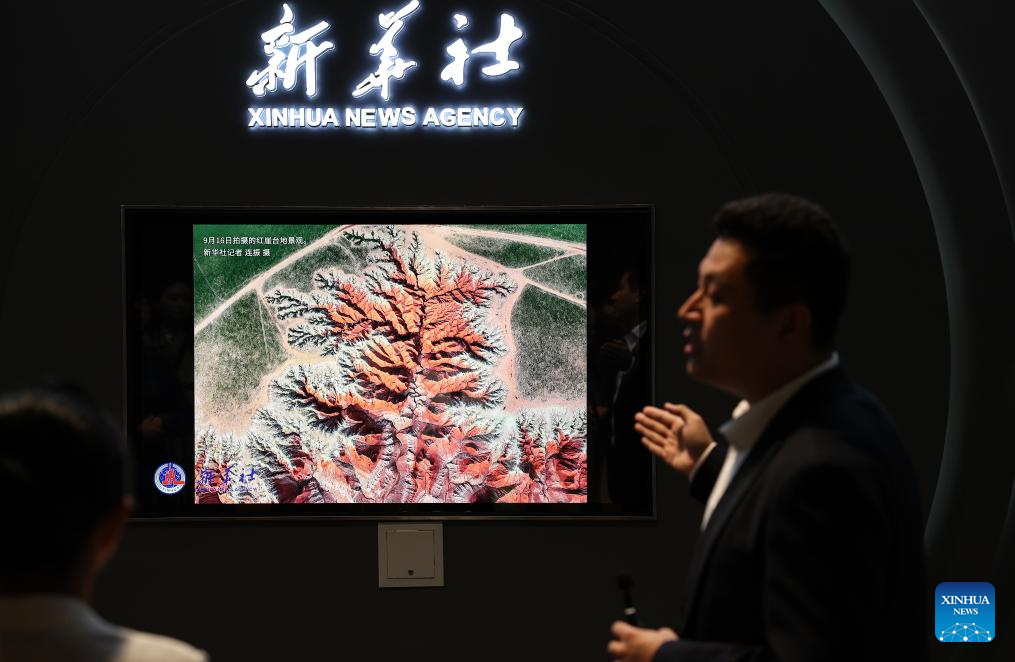 A guide introduces exhibits at a photo exhibition on China's historic transformation held by Xinhua News Agency in Beijing, capital of China, Sept. 26, 2024. China's national news agency, Xinhua, on Thursday opened a photo exhibition documenting the historic transformation of the country over the past decades.