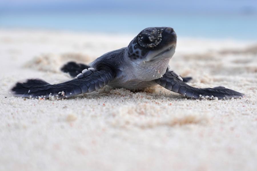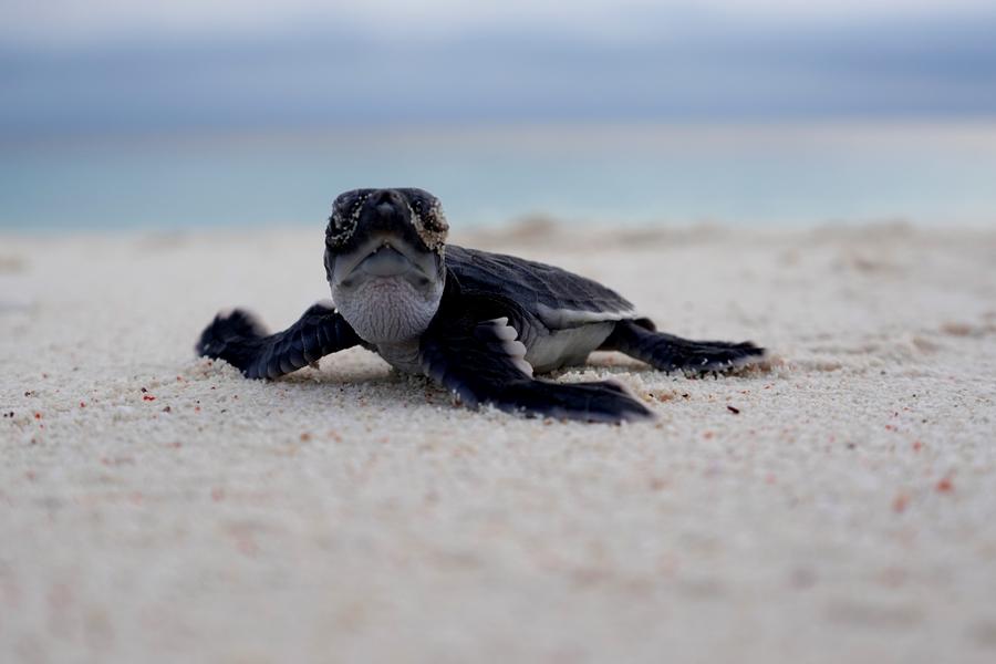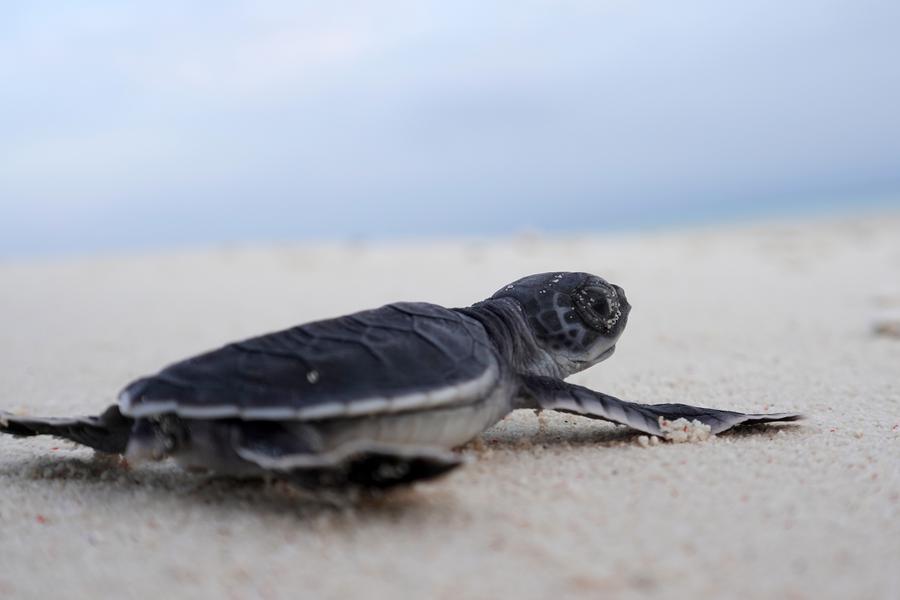 Photo taken on Sept. 26, 2024 shows a baby green sea turtle on Bilang-bilangan island, Berau regency, East Kalimantan, Indonesia. (Photo by Armand/Xinhua)
