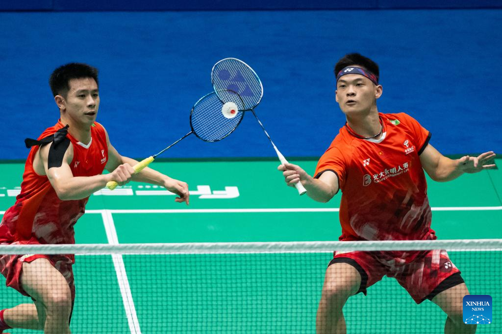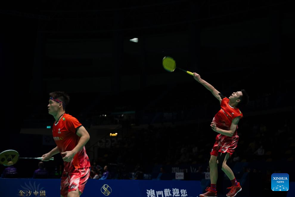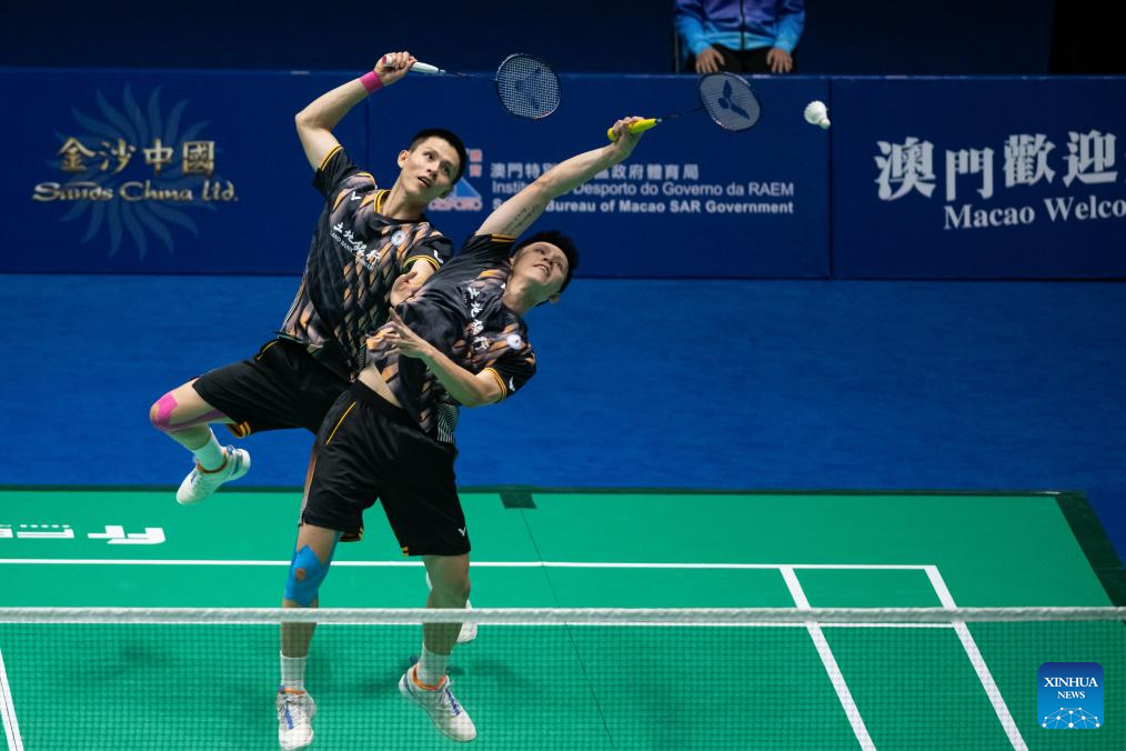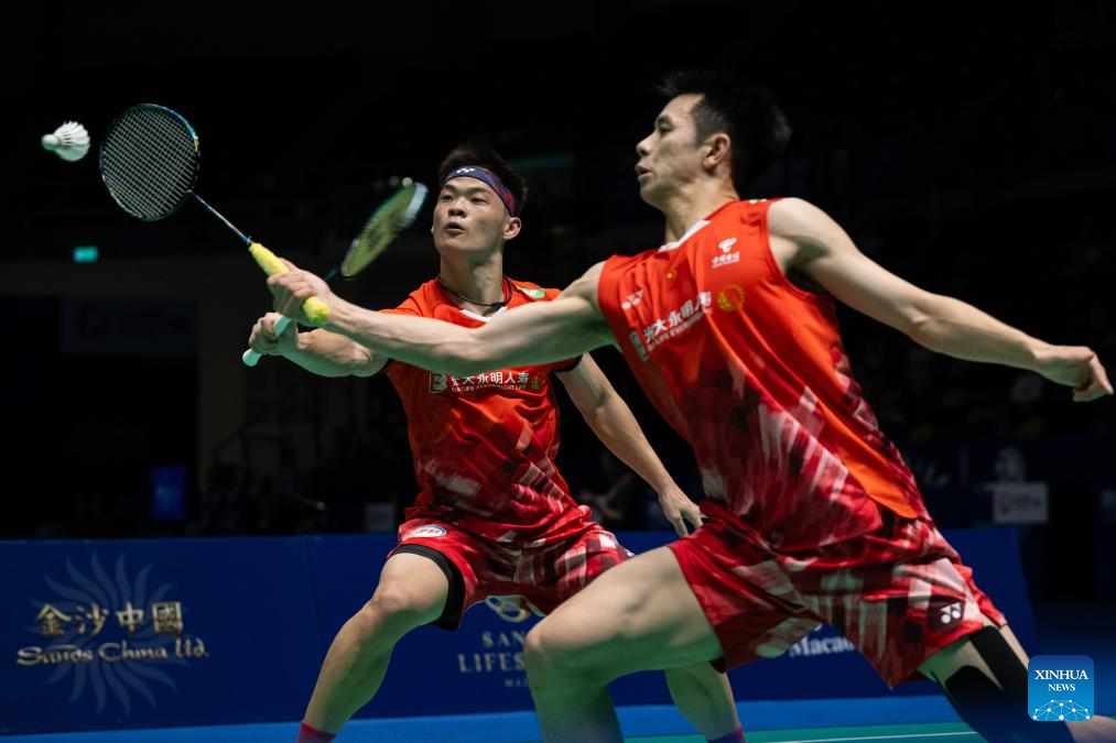 Lee Fang-Chih (L)/Lee Fang-Jen compete during the men's doubles semifinal match between Chen Xujun/Liu Yi of China and Lee Fang-Chih/Lee Fang-Jen of Chinese Taipei at Macao Open Badminton 2024 in Macao, south China, Sept. 28, 2024. (Xinhua/Cheong Kam Ka)