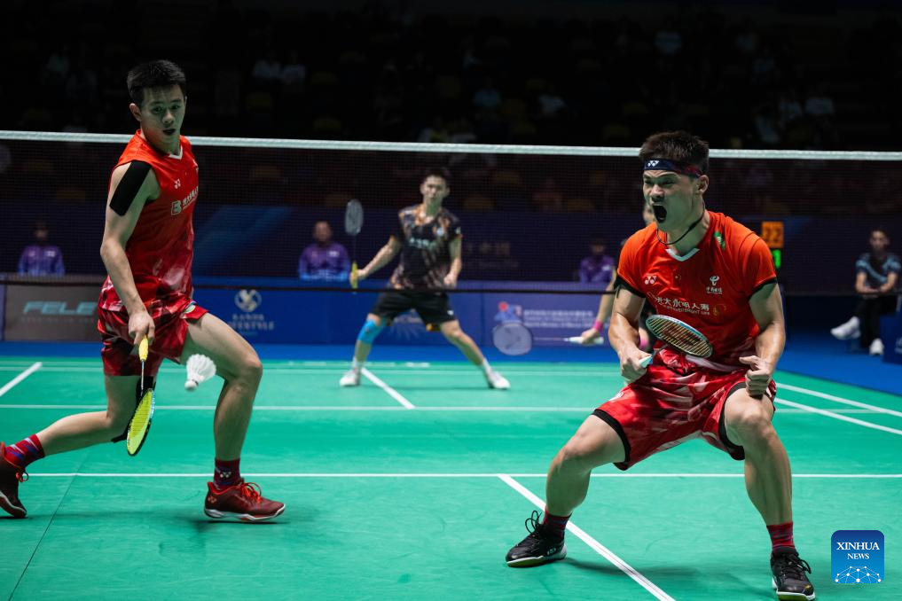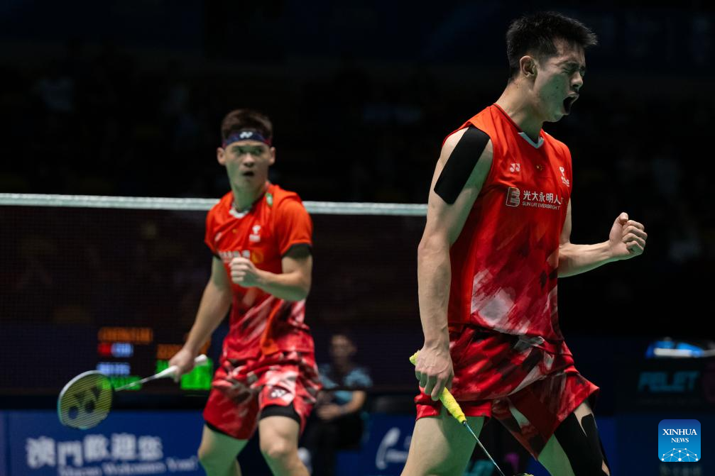 Chen Xujun/Liu Yi (L) compete during the men's doubles semifinal match between Chen Xujun/Liu Yi of China and Lee Fang-Chih/Lee Fang-Jen of Chinese Taipei at Macao Open Badminton 2024 in Macao, south China, Sept. 28, 2024. (Xinhua/Cheong Kam Ka)