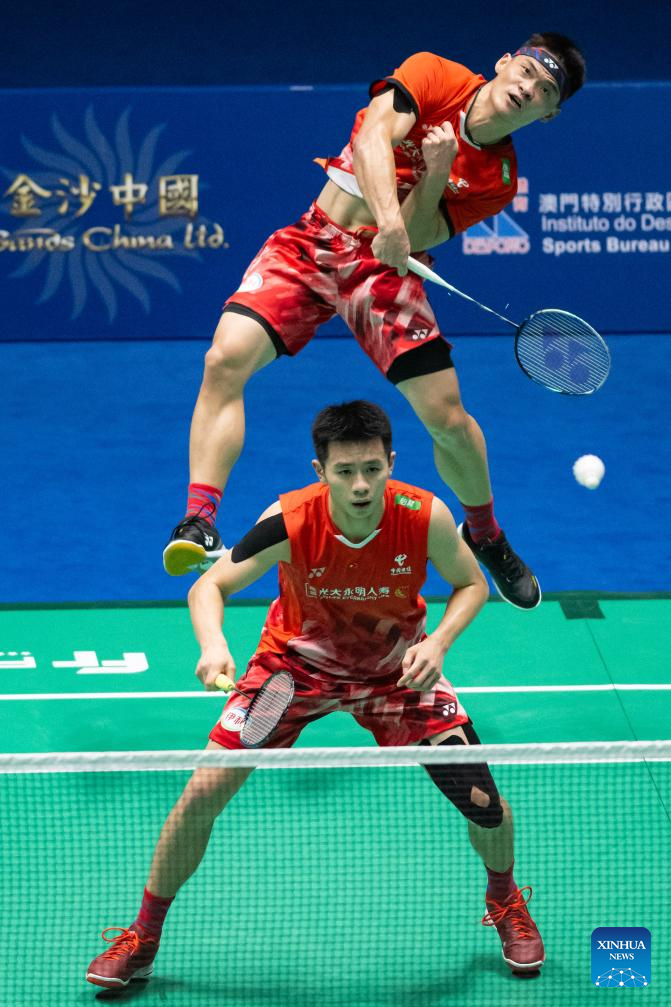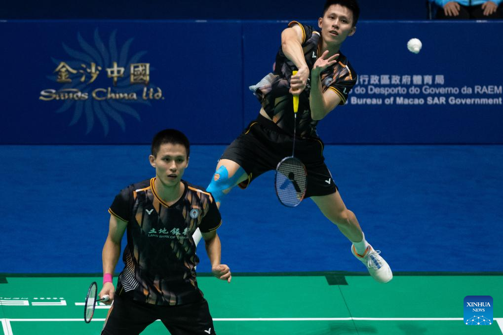 Chen Xujun (R)/Liu Yi compete during the men's doubles semifinal match between Chen Xujun/Liu Yi of China and Lee Fang-Chih/Lee Fang-Jen of Chinese Taipei at Macao Open Badminton 2024 in Macao, south China, Sept. 28, 2024. (Xinhua/Cheong Kam Ka)