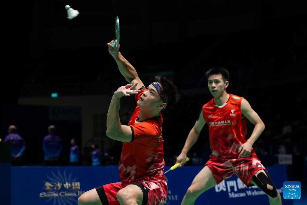 Chen Xujun/Liu Yi (R) compete during the men's doubles semifinal match between Chen Xujun/Liu Yi of China and Lee Fang-Chih/Lee Fang-Jen of Chinese Taipei at Macao Open Badminton 2024 in Macao, south China, Sept. 28, 2024. (Xinhua/Cheong Kam Ka)