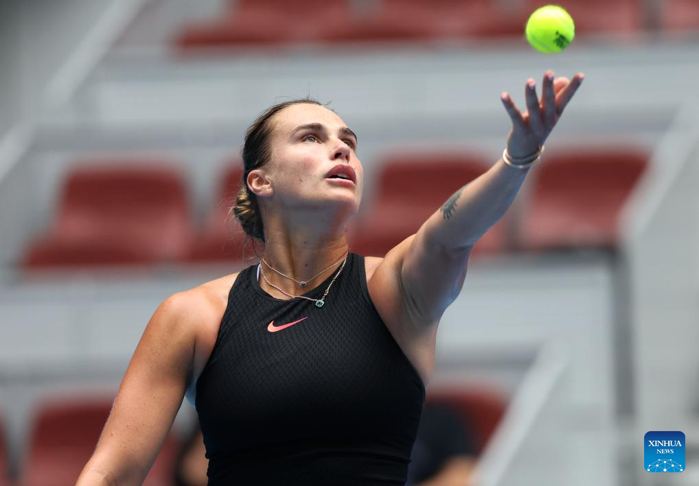 Aryna Sabalenka of Belarus competes during the women's singles second round match between Aryna Sabalenka of Belarus and Mananchaya Sawangkaew of Thailand at 2024 China Open tennis tournament in Beijing, capital of China, Sept. 28, 2024. (Xinhua/Zhang Chenlin)
