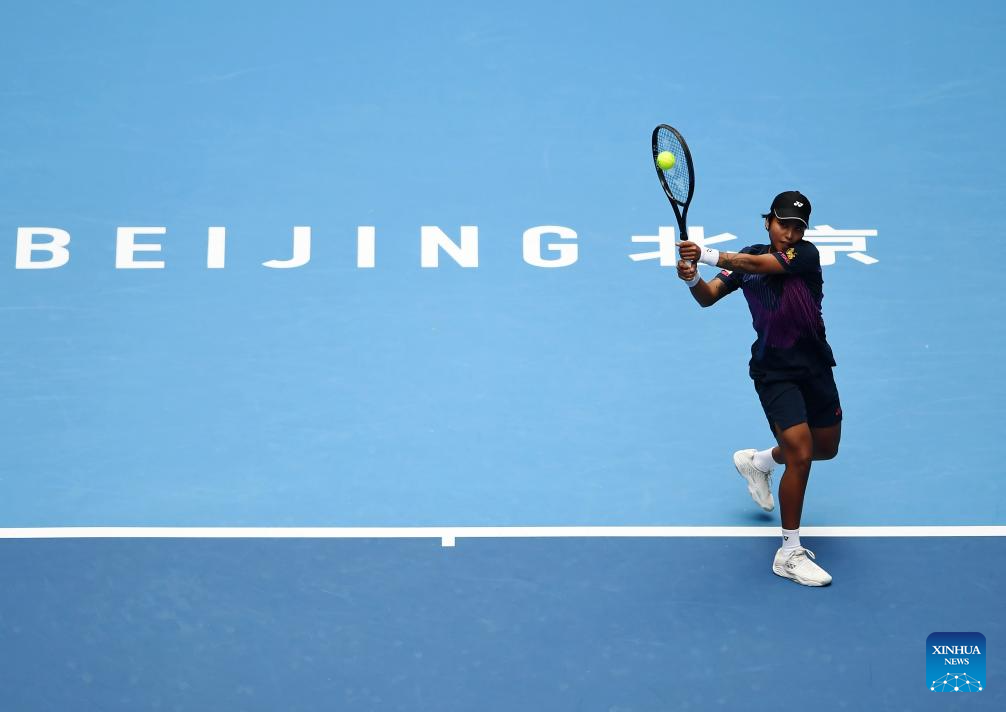 Wei Sijia of China hits a return during the women's singles second round match between Wei Sijia of China and Beatriz Haddad Maia of Brazil at 2024 China Open tennis tournament in Beijing, capital of China, Sept. 28, 2024. (Xinhua/Zhang Long)